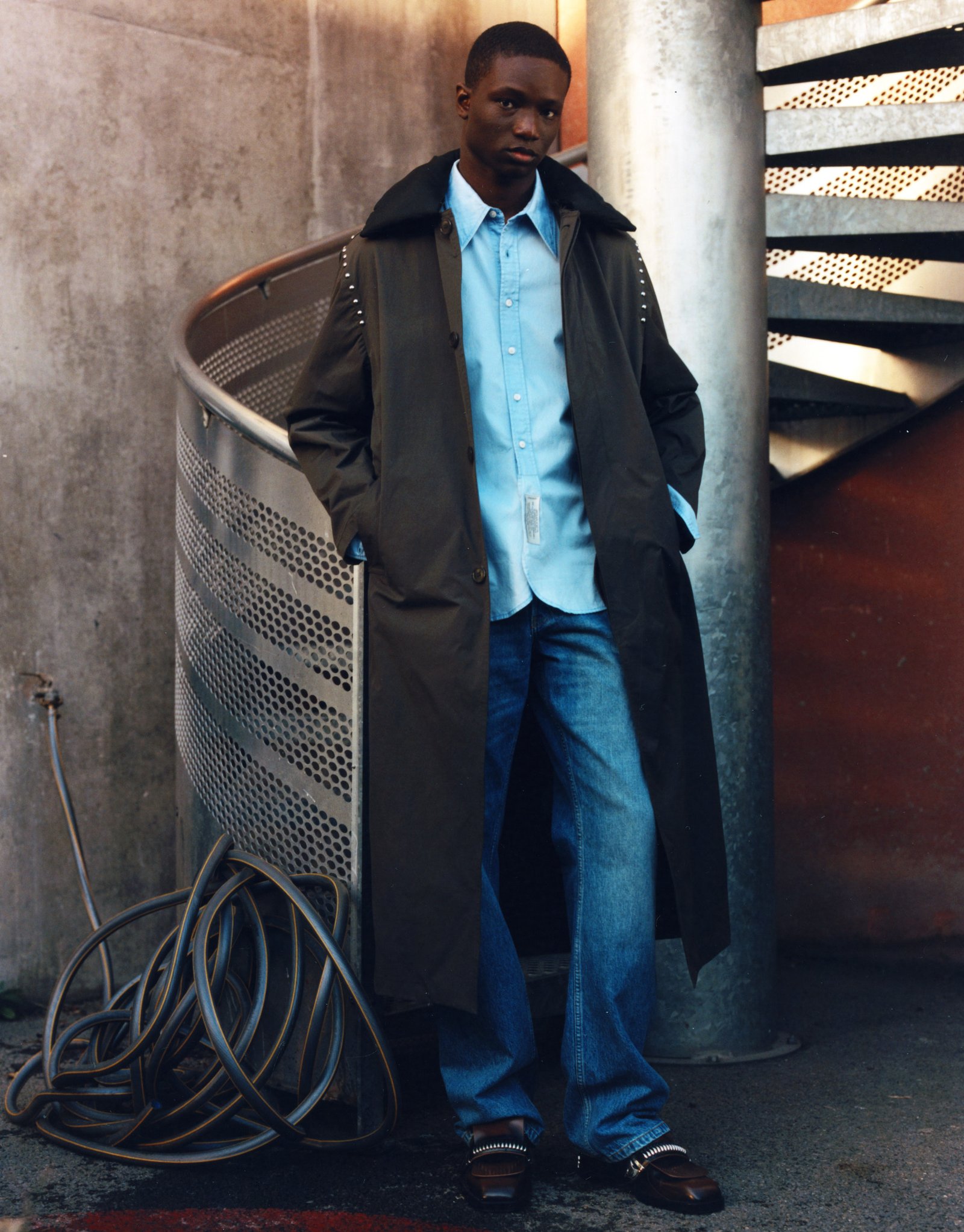 Mamadou wears coat, shirt, jeans and loafers BLUEMARBLE.