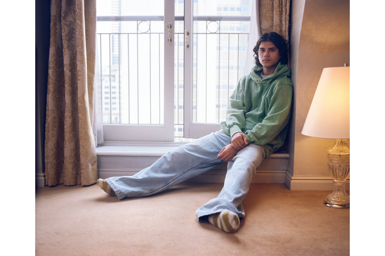 Budjerah wears hoodie Les Tien, t-shirt and socks Mr. P., and jeans Acne Studios.