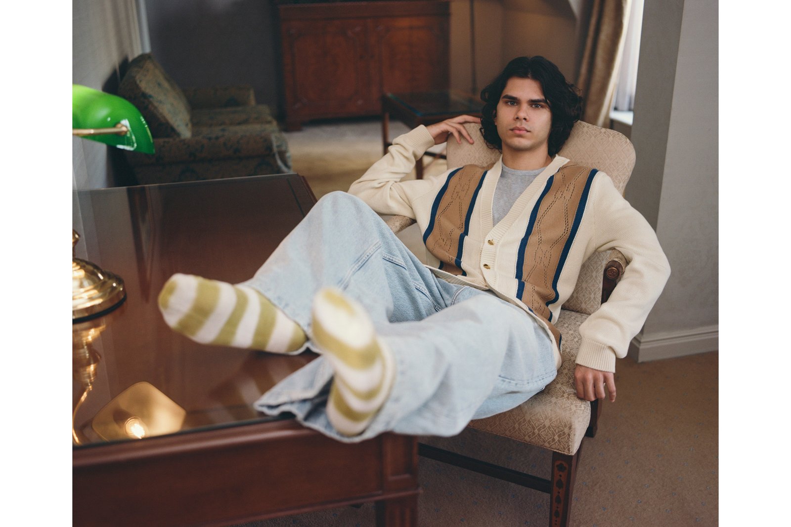 Budjerah wears Cardigan Gucci, Jeans Acne Studios, t-shirt and socks Mr. P.