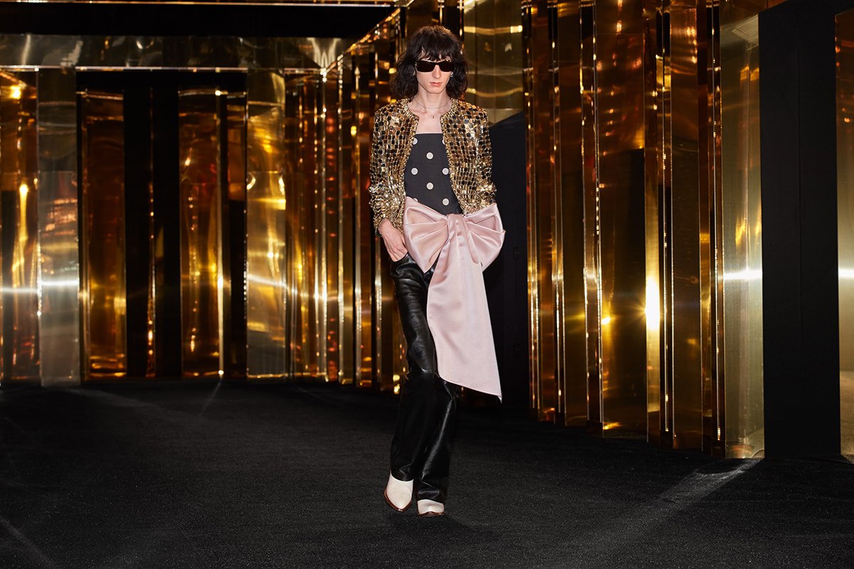 Interplay between ballet dancer Laurids Seidel and Celine Homme models recalls a 2010 Hedi Slimane film that contrasted an indie rock drummer’s solo and Oscar Nilsson, a ballet dancer. Slimane’s historic continuity between classical and contemporary influences is on fantastic display throughout ‘Delusional Daydream.’ Notice the duchesse satin bows that warp, wrap and mutate onto models, giving feminine feelings seen in historic collections from Paris couturiers Christian Lacroix and Yves Saint Laurent. Additionally, a quiet specter of Bobby Gillespie’s ghost (circa-1994) circles around the collection’s iridescent qualities.