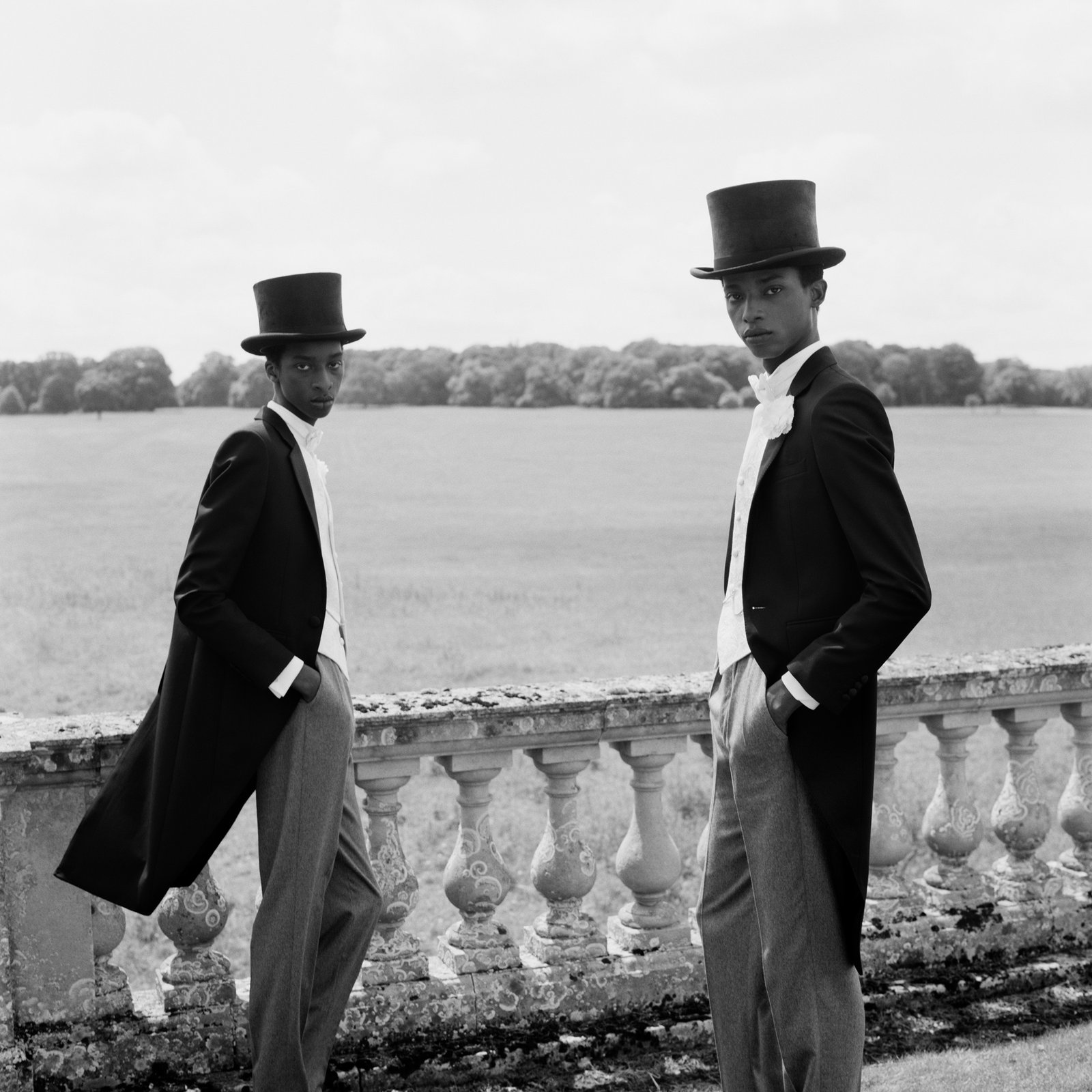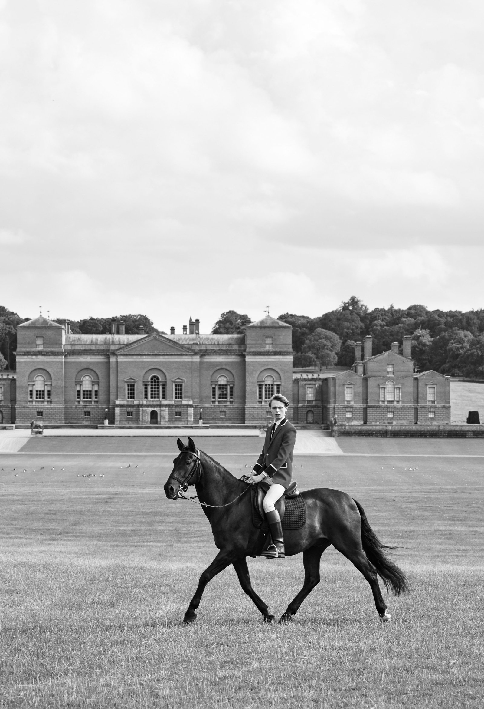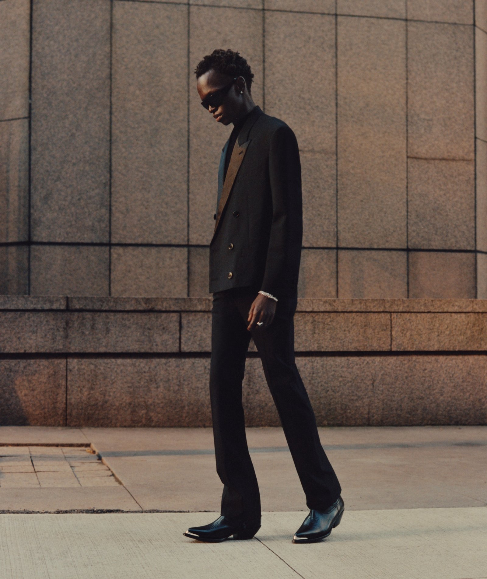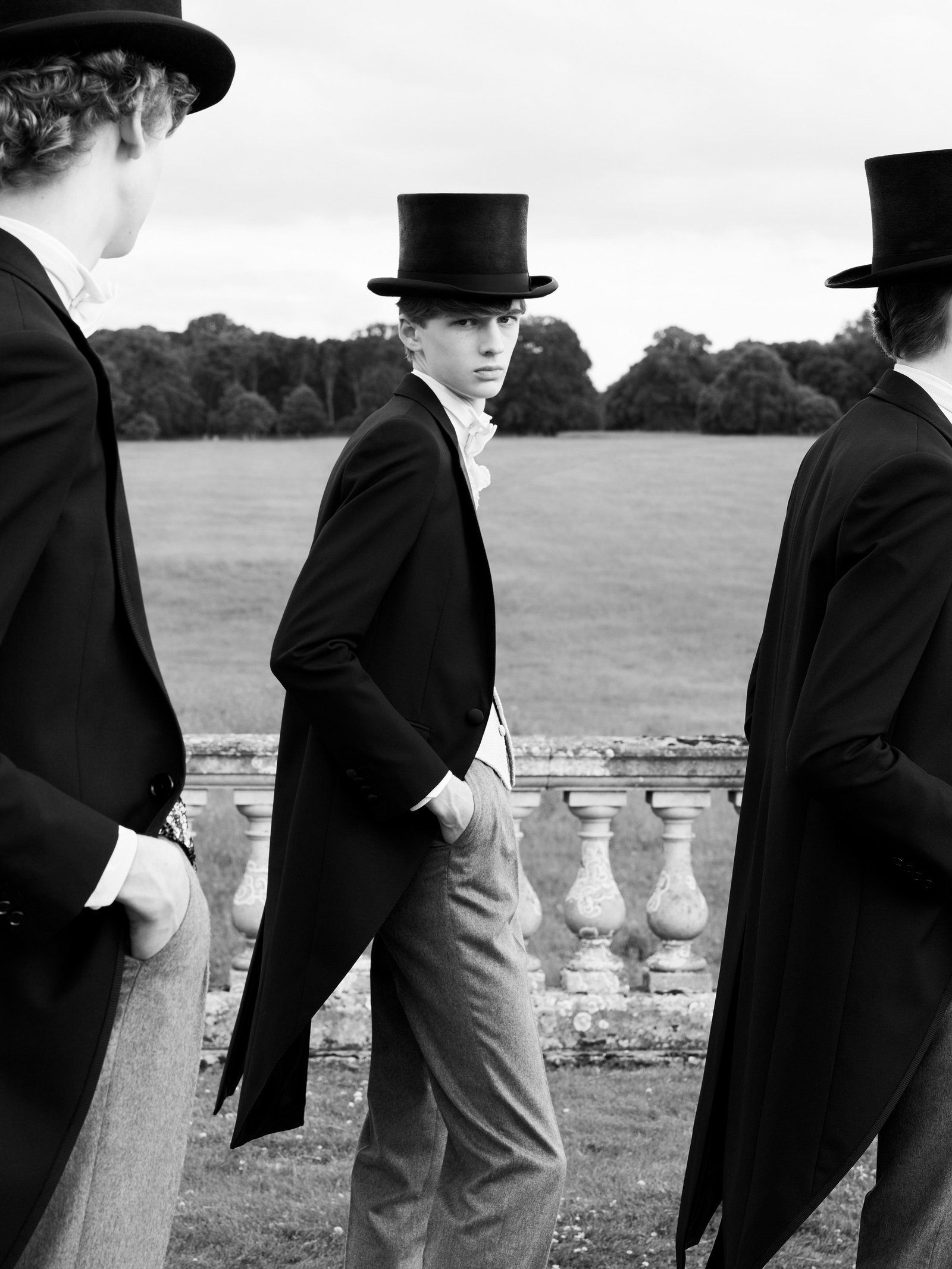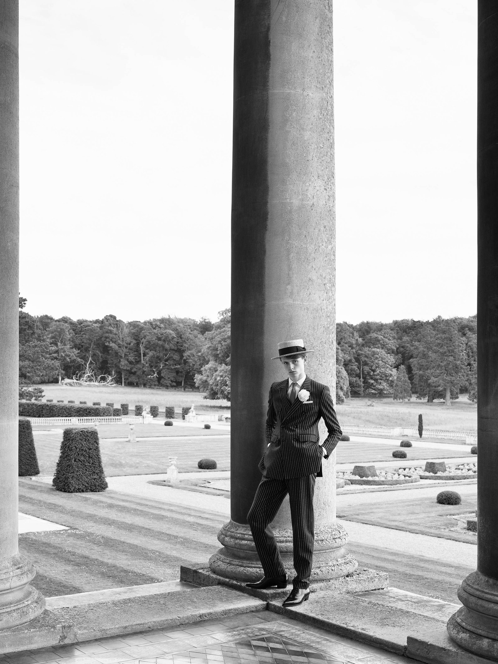 For his Summer 2025 collection, the French designer takes us across the English Channel to the austere Palladian-style Holkham Hall, situated in the small village of Norfolk in England’s east coast countryside. The largely unchanged 1764 estate sets a cast of young men strolling the grounds in the British-coded collection. Slimane’s vision feels reminiscent of a 1998 Prince Harry on his first day at Eton College, with pinstriped trousers, slender tailcoats, and tophats. A decidedly intentional undertone set with the show’s opener, the 20-year-old British actor Harry, a former Etonian himself. All recreation for the young isn’t devoted to trumpeting and rowing; catch glimpses of modern-day after-hours looks that wouldn’t be out of place on London’s young, affluent partiers in HBO’s Industry; think neat black leather jackets, a nonchalant silk neck scarf, and red stamped calfskin Chelsea boots. Slimane has thought of everything, as he always does.