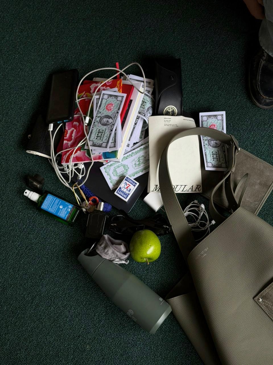 No kidding, the following are all the things I kept in that bag all week long (and they all fit perfectly): laptop, bottle of water, sunglasses, two books, agenda, diary, deodorant, perfume, a green apple, a portable battery, phone and laptop chargers, a tote bag, and a box of matches.