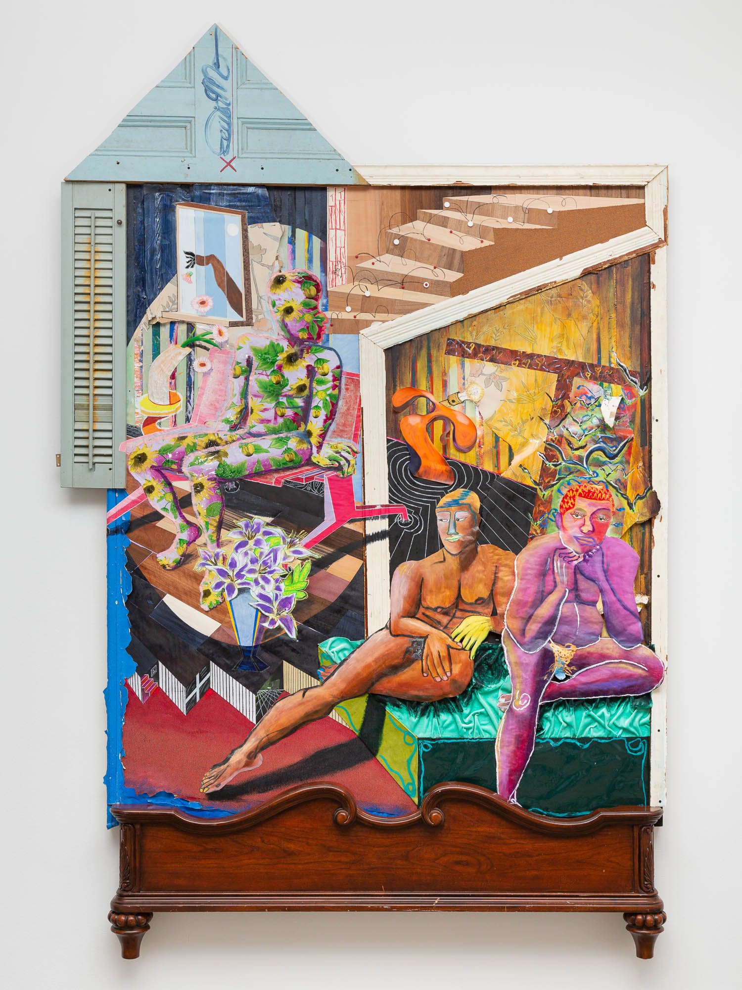 Across installation, video, mixed media paintings, and collage, Devin N. Morris takes us into surreal, fluid spaces of intimacy. Re-drawing the dimensions of the domestic both visually and conceptually, Morris has devoted his practice to the imagining of histories, presents, and futures of kinship which might both exist within and challenge the norms of American social life. Morris’s work often turns around gestures of kindness, vulnerability, and innocence, and he sets men’s closenesses especially — whether platonic or otherwise — in celebratory light.