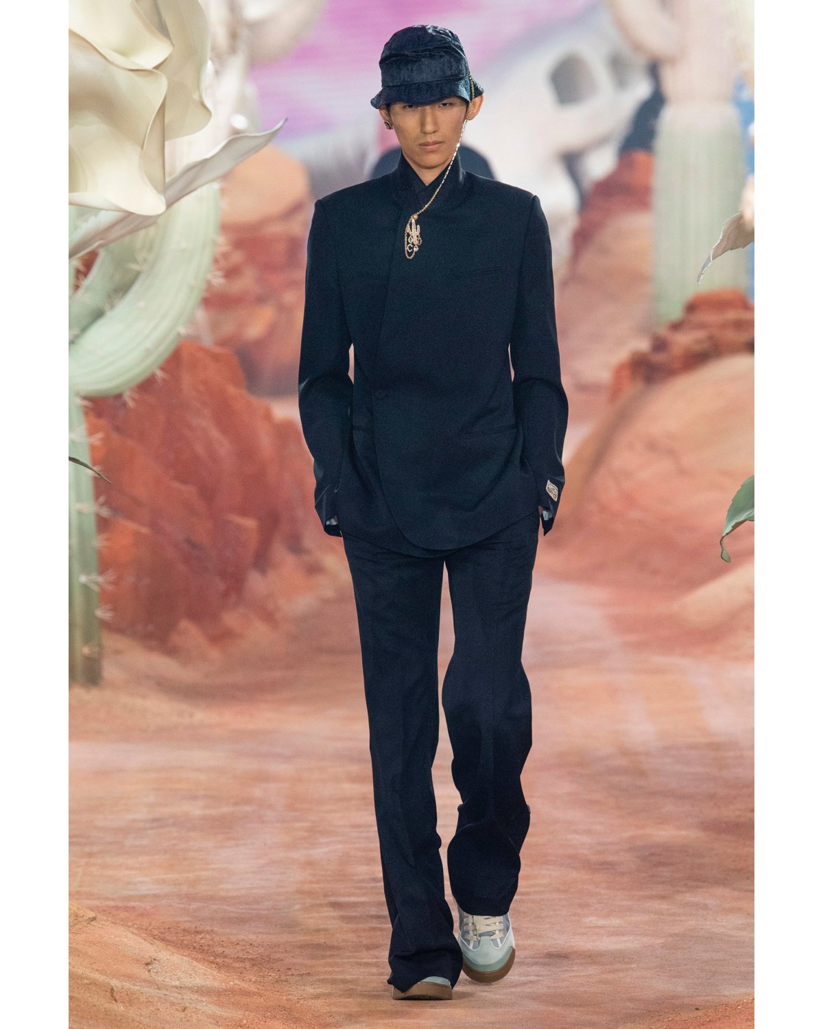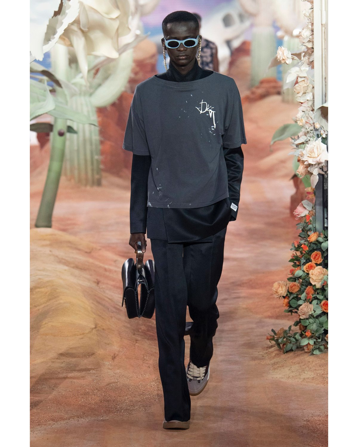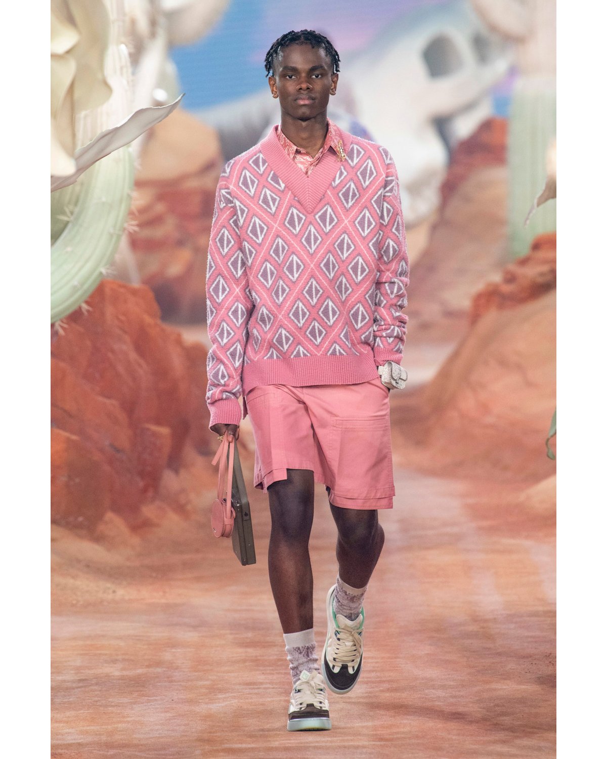 The Saddle bag reappears in a sultry snakeskin in sunset orange. Dior premieres a broad skate shoe, a nod to Scott’s wardrobe staple, the Nike Dunk, which the rapper had a heavy hand in bringing back into trend. A graphic sweater vest featuring a Dior motif matched with a string of pearls and an iced-out cactus takes on the season’s latest trends with a hint of classic rapper bravado.
