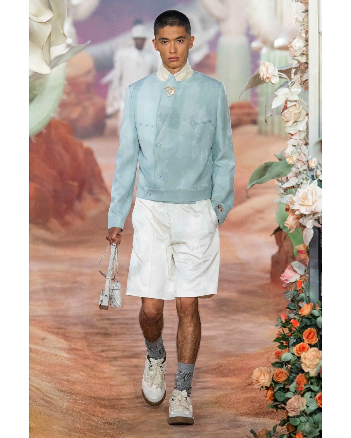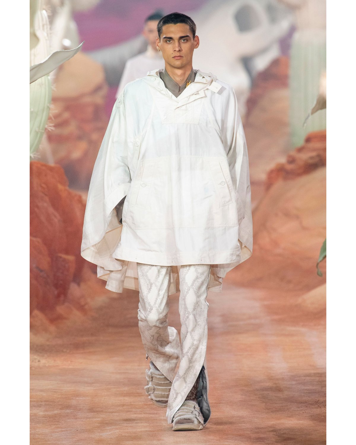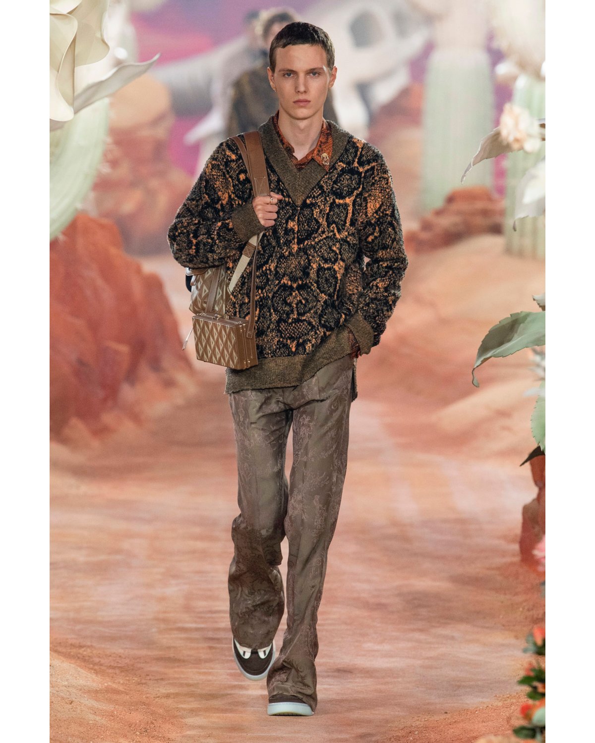 Jones introduces new patterns alongside classic Dior tiling: lace-like snakeskin sweaters in hazelnut and tangerine stir intrigue, appearing in calm beiges and rusty gold hues. A lime green floral pattern laid over beige and coconut brown take on Scott’s desert inspiration with an industrial flair. Padded motorcycle pants in dusty rose call to evening bike street races in warm Texas air. Sheepskin-trim buckled sandals and slouchy printed socks infuse a street style caught-by-paparazzi ease to trousers and tailored shorts. A cream raffia sweater paired with belted pouches printed with a geometric pattern takes Dior Men to the resort.