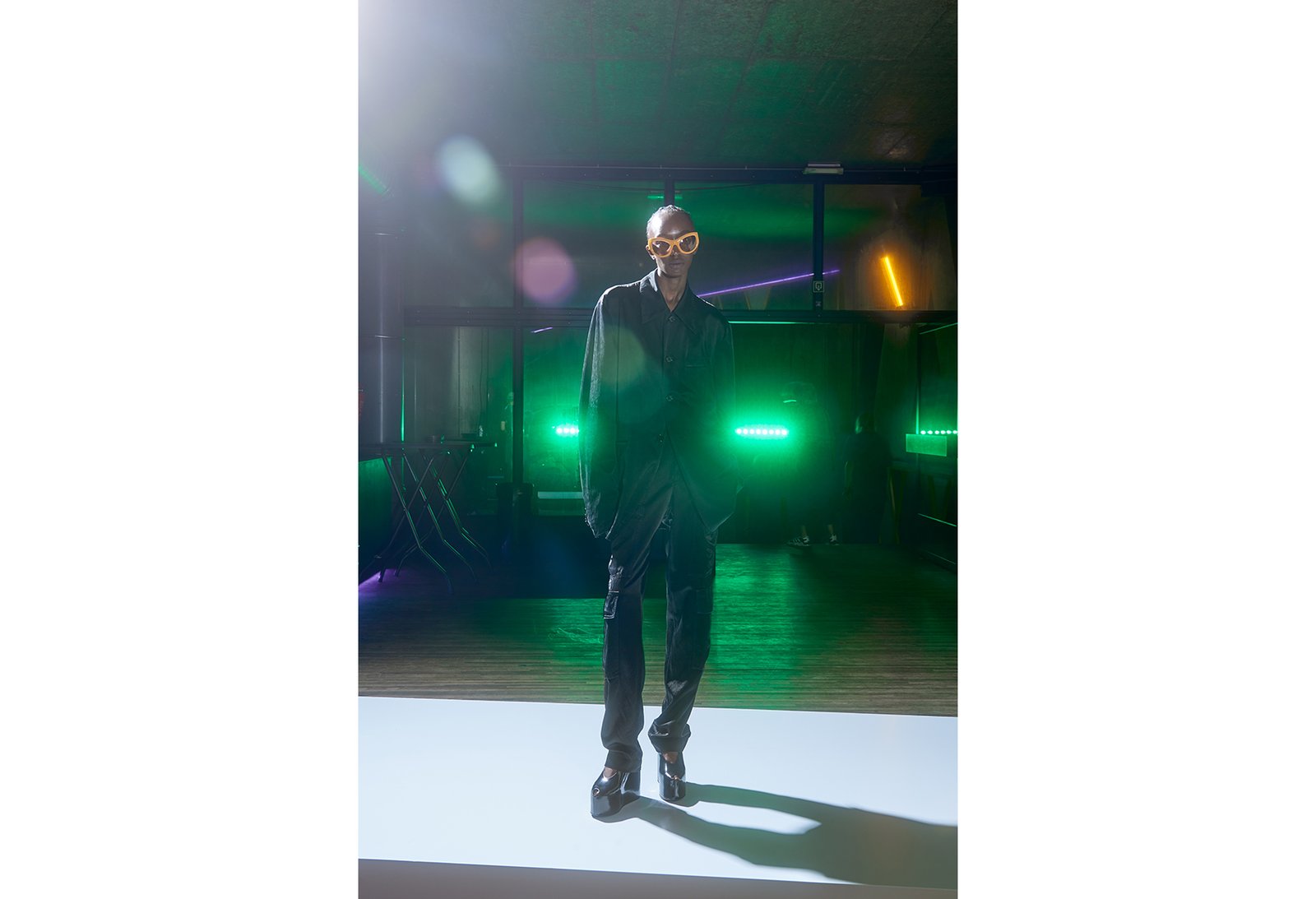 As we start to come to a close of our tour, the backdrop fades from day to night. The looks also begin to adapt to the city’s evening aroma, and the feeling of going out and doing what you want begins to ignite. Color begins to fade but is brought back suddenly with a monogram ‘A’ on a trench coat which can only stand for one thing. With clubs and bars as a backdrop now, a more sexy and cool tone is evoked. Black uniform suits with the same light and fluid fabric touch dance a little more with pops of the bold colors seen earlier in the collection.