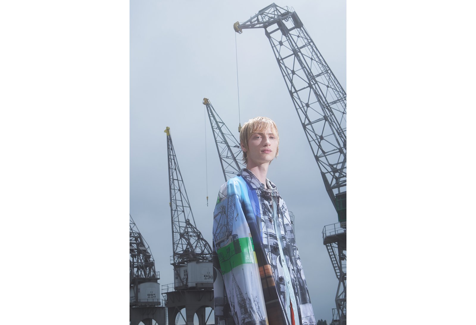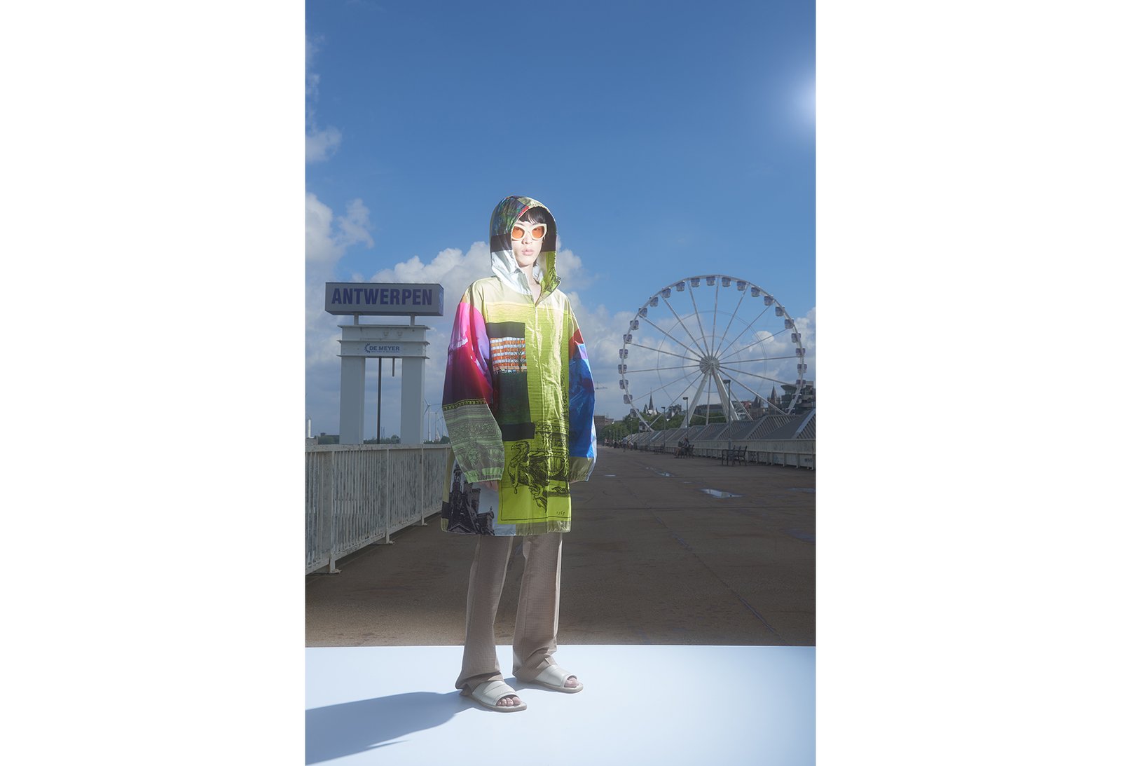 A sample of Primal Scream’s Loaded says, “We wanna be free to do what we wanna do,” as we fly over the river Scheldt – and the fashion tour begins. Van Noten begins with his staple print innovations. Lightweight outwear paneled and collaged with luminous printed images of Antwerp’s construction and architectural sites juxtaposed against an ever-changing location of the city’s landmarks.