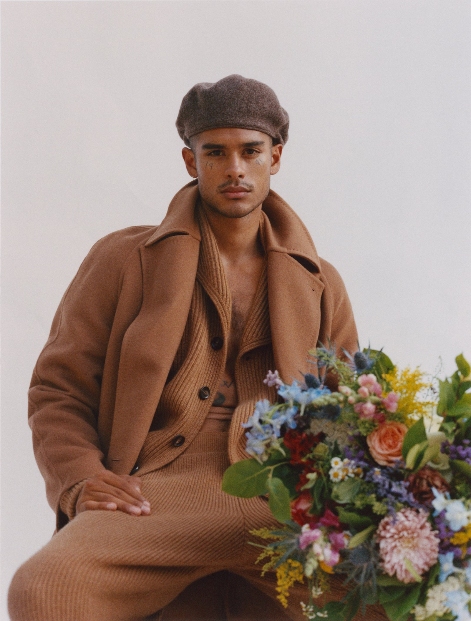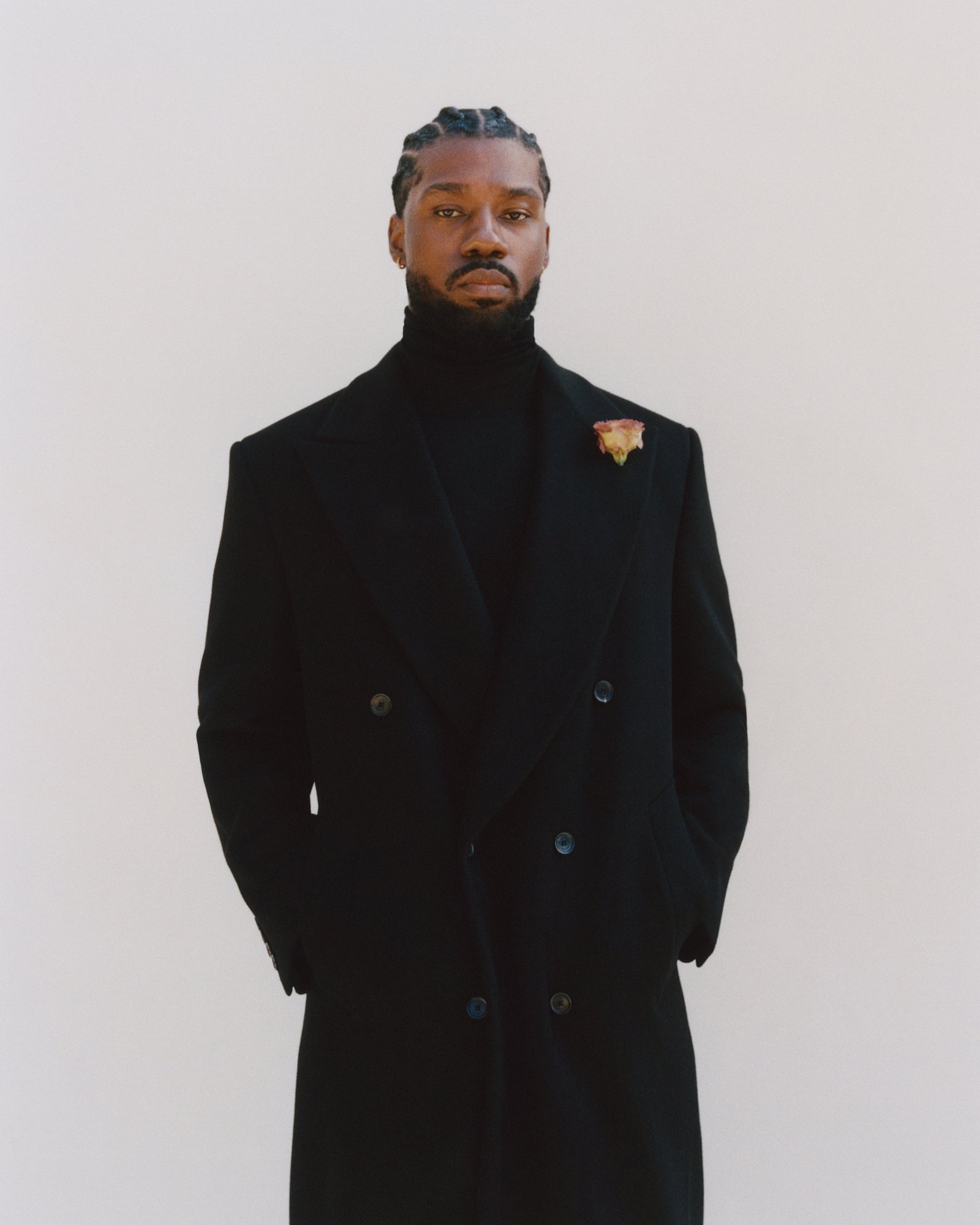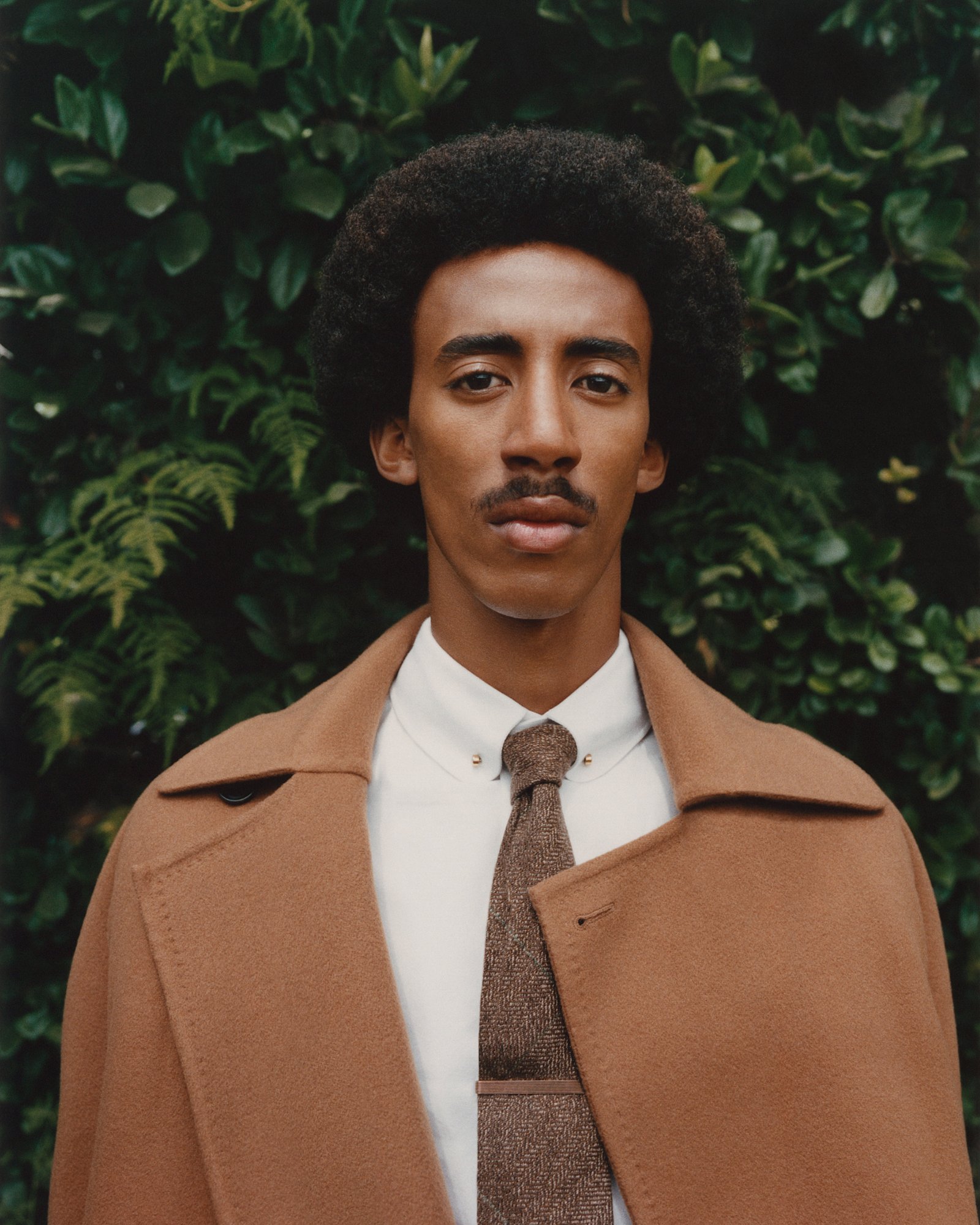 Eyoel wears coat, shirt and tie LORO PIANA.