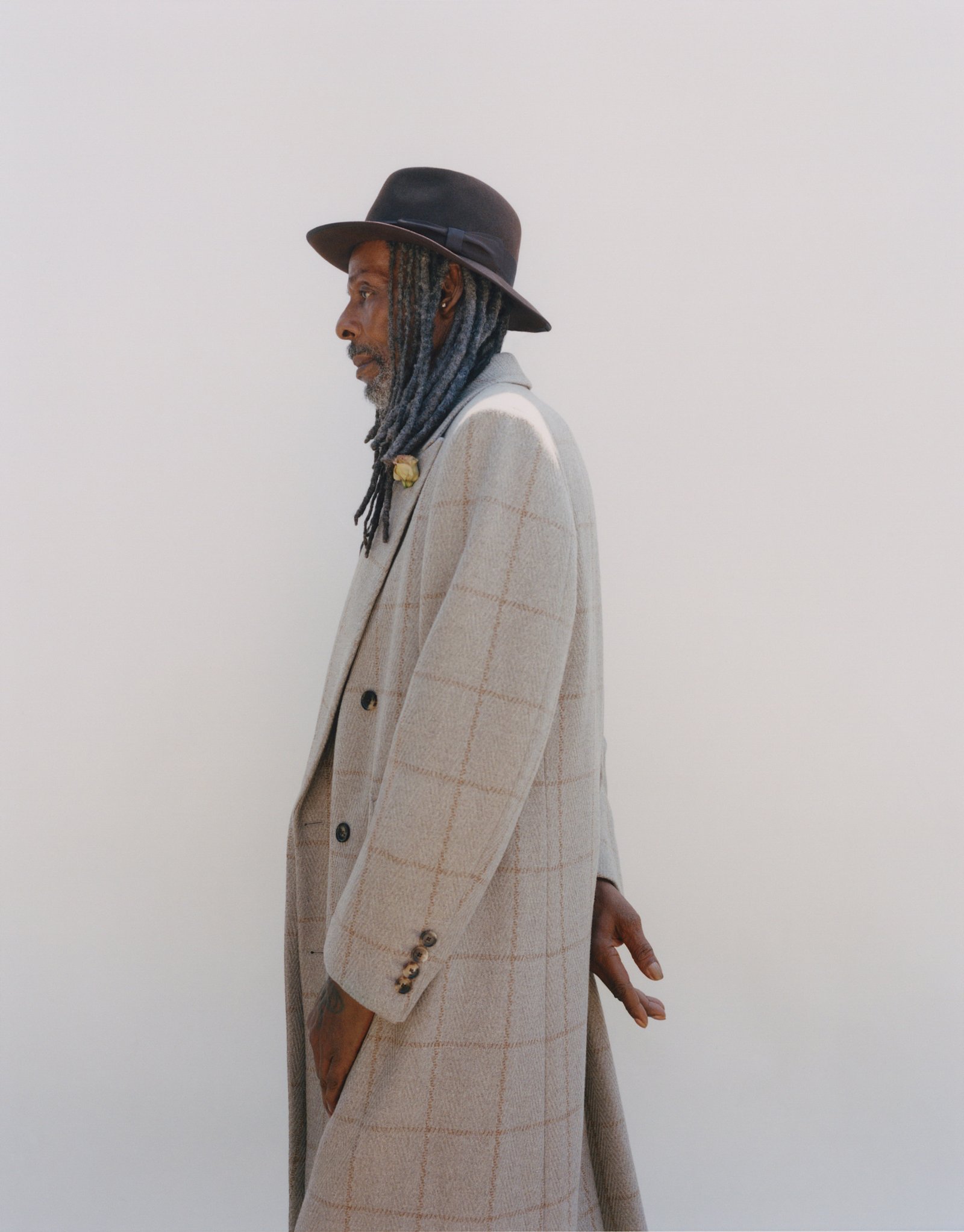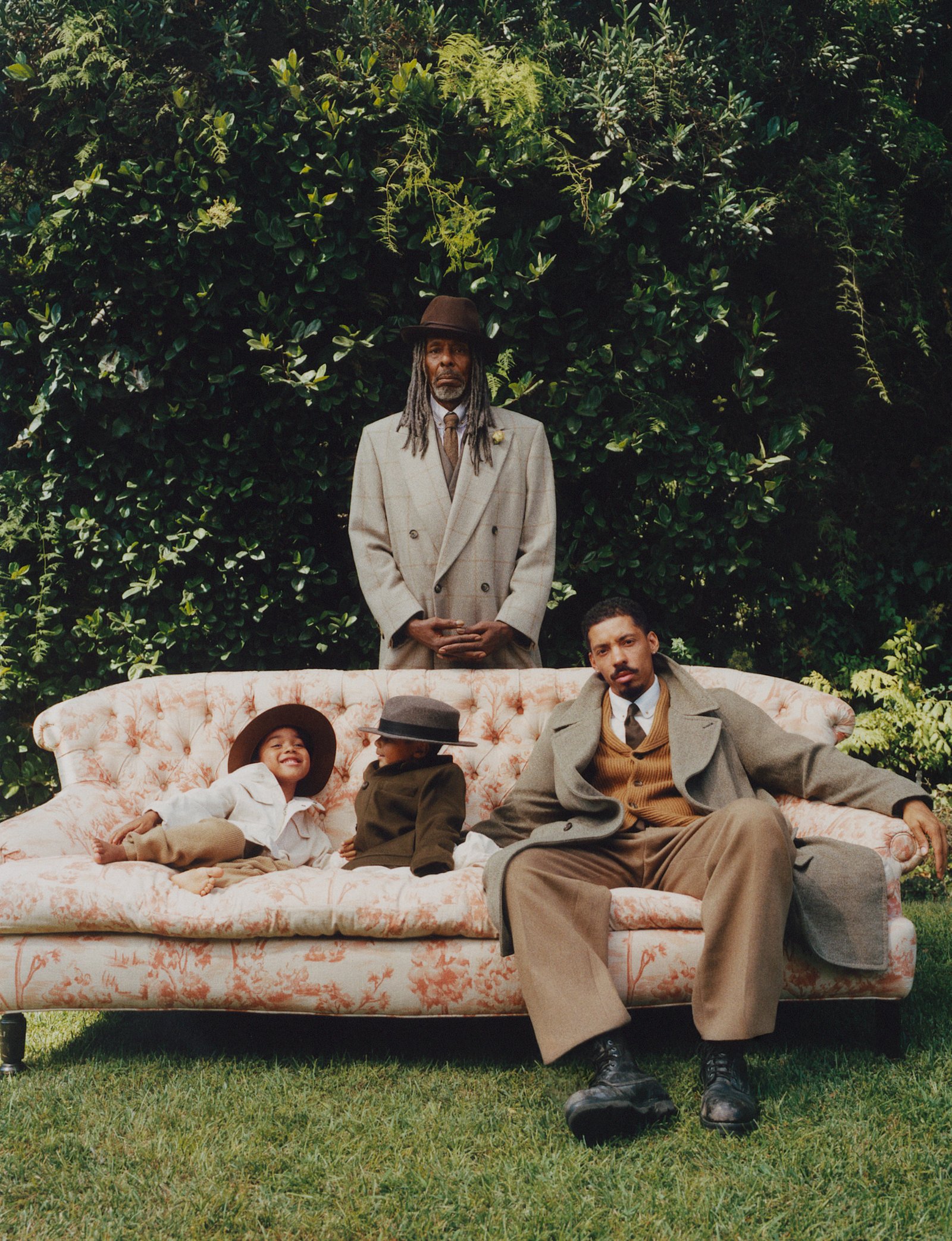 Melvin Vaughn (back center) wears coat, jacket, hat and tie LORO PIANA. Marley (left) wears jacket, pants and hat LORO PIANA. Sonny (center) wears jacket and hat LORO PIANA. Melvin Gregg (right) wears coat, sweater, shirt, pants and tie LORO PIANA. Shoes stylist’s own.