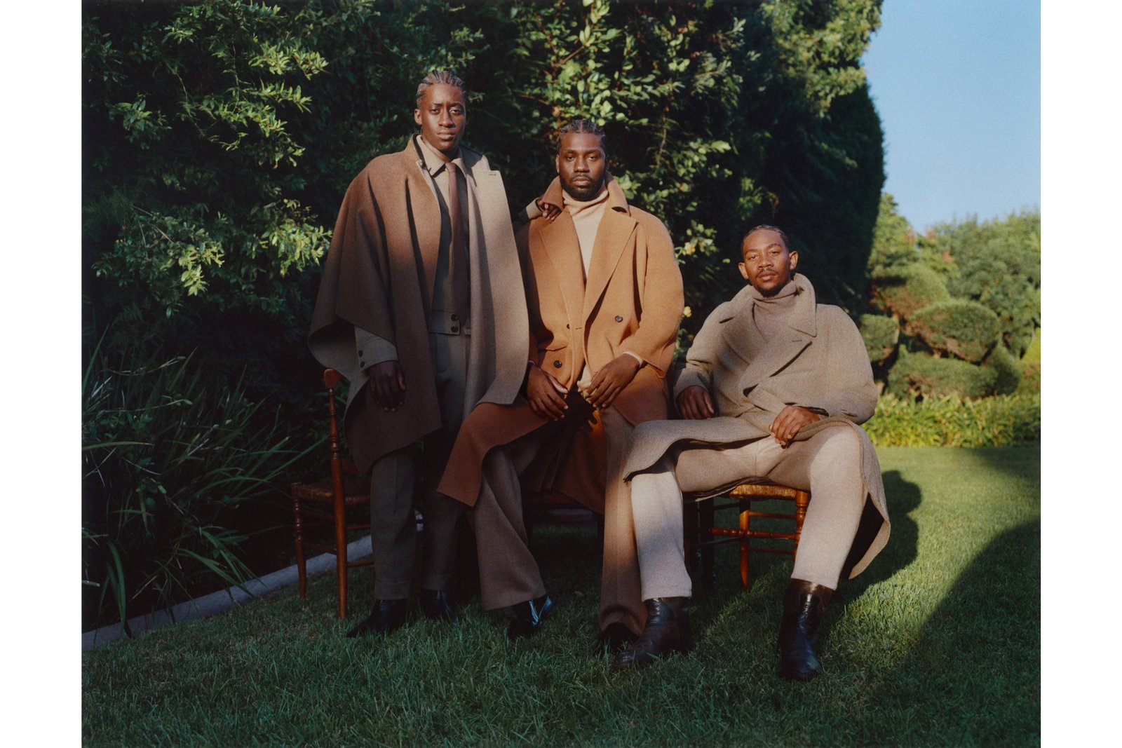 Ouzi (left) wears coat, shirt and pants LORO PIANA. John (center) wears coat, sweater and pants LORO PIANA. Tyler (right) wears coat, sweater and pants LORO PIANA.