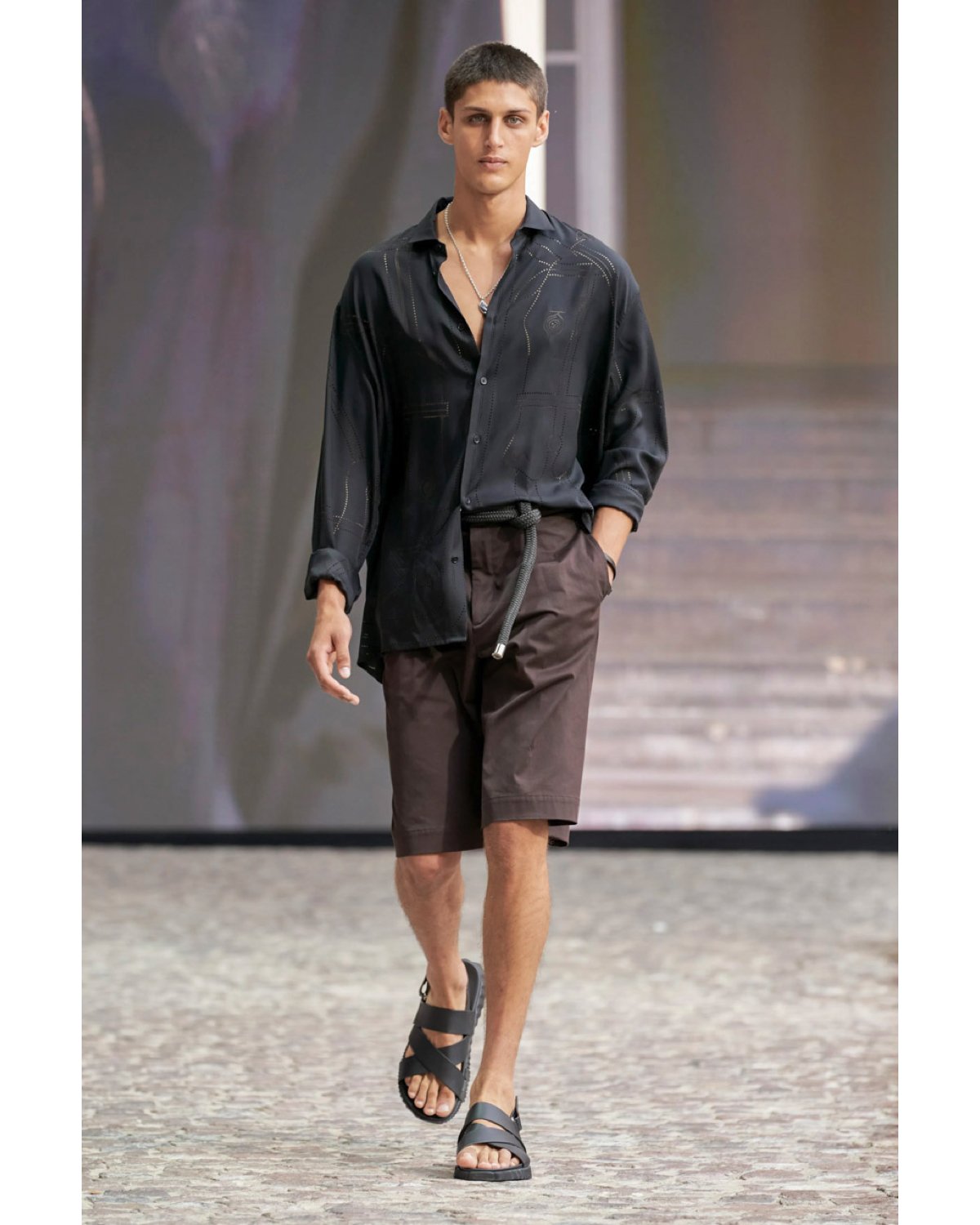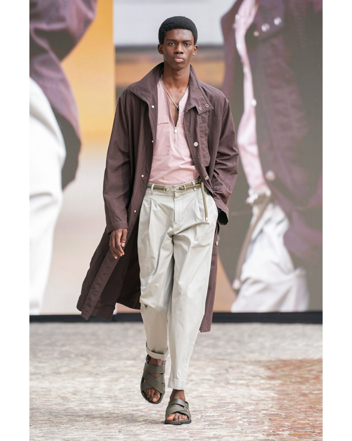 Outfits were styled with casual sneakers, classic Chelsea boots in perforated black or walnut leather, and fawn suede. In addition, Nichian debuted a strappy flat sandal, fastening the foot in mossy green and black with a bohemian ambiance.
