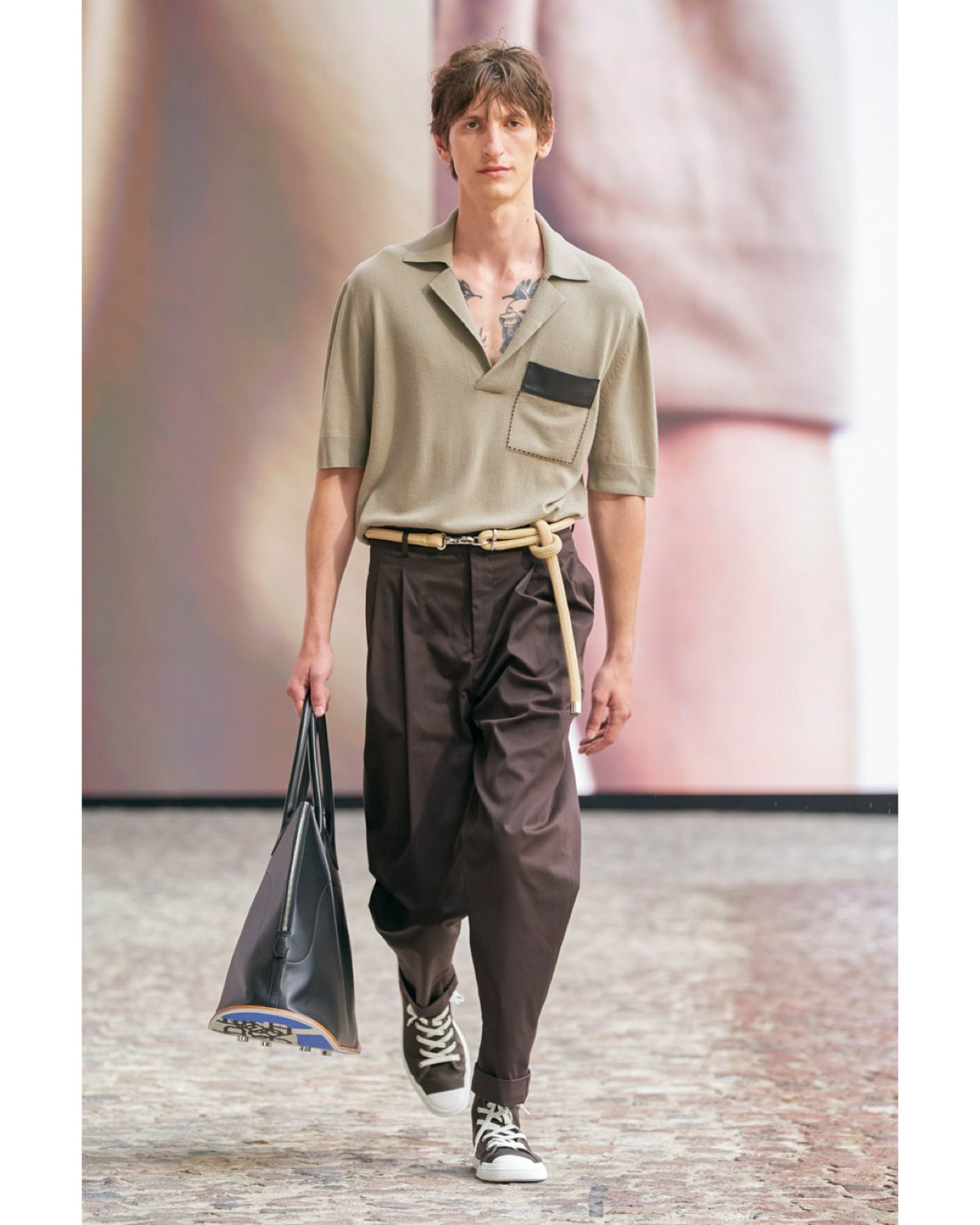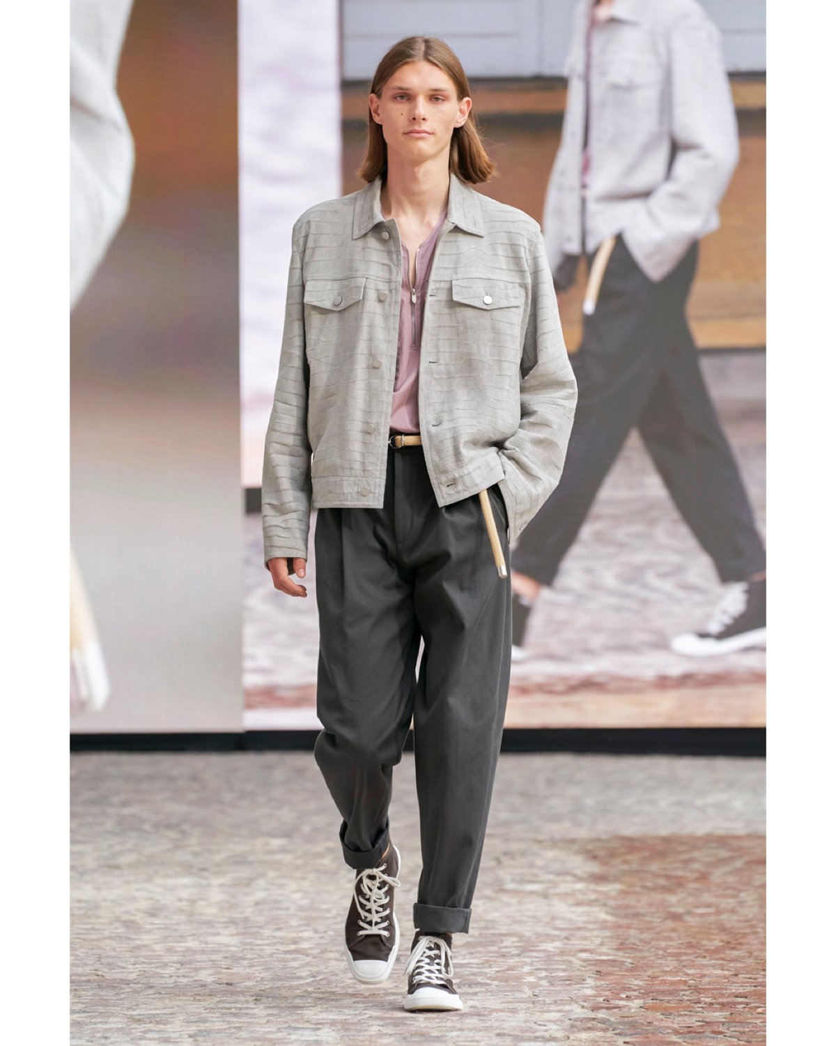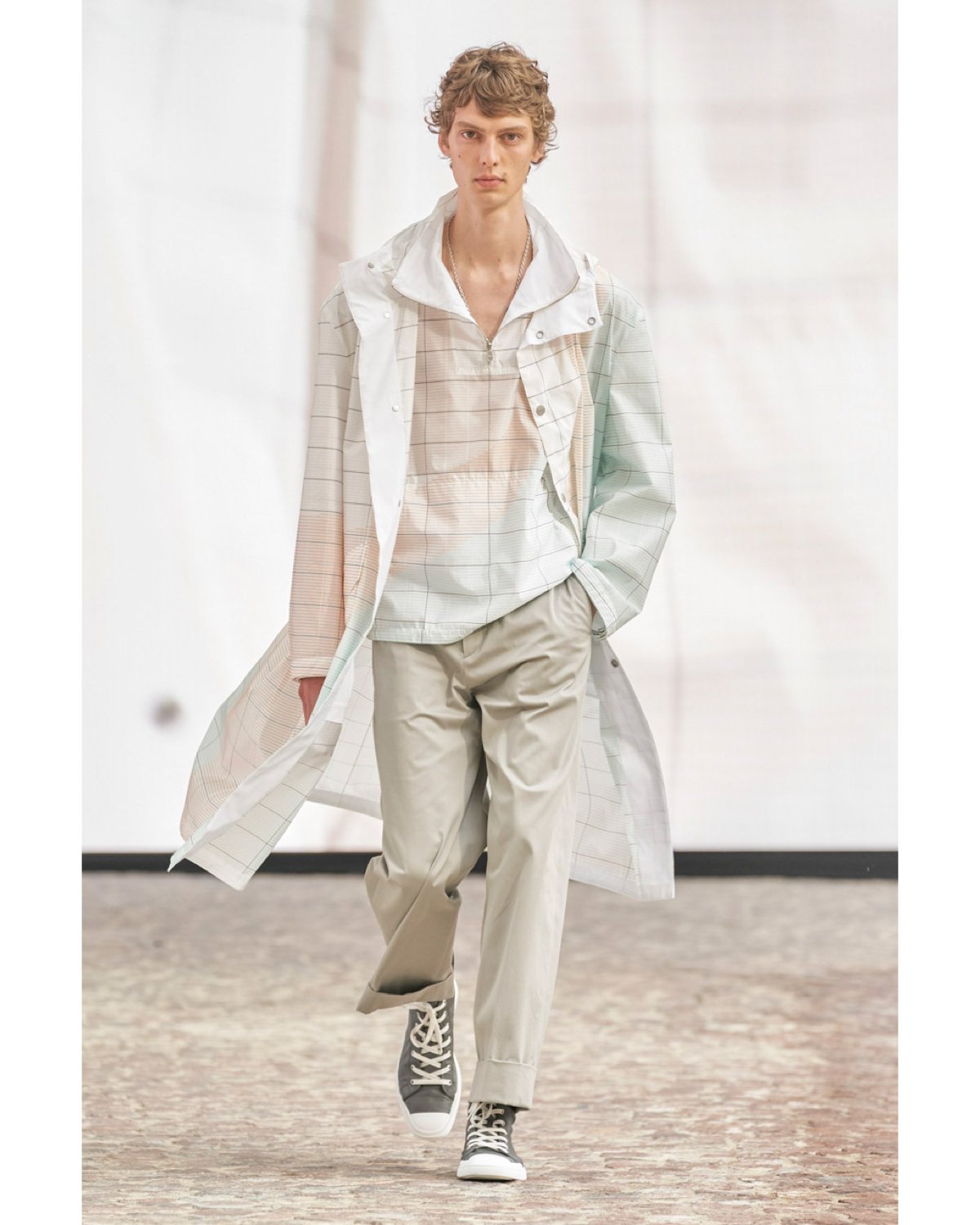 This season, Nichanian placed her attention on paneling and soft hues. Nichanian's Hermès explores a cool, earth-toned palette of cocoa brown, khaki, beige, camel, olive, dusky pink, robin's egg blue, and grey. Breezy blousons catch the breeze in various textures, fastened with zippers and oversized breast pockets. Knit separates, and sport coats appear in a verdant dandelion yellow. A translucent white collared shirt and matching raincoat float down the runway in a calculating grid print. Trousers are relaxed, paired with quarter-zip dress shirts and polo knits. Rope belts cinch the hips for a subtle nudge towards summertime sailing. Nylon sport coats and anoraks layer matching pants, while crocodile-stamped trucker jackets add a youthful hint to cool-guy calm.