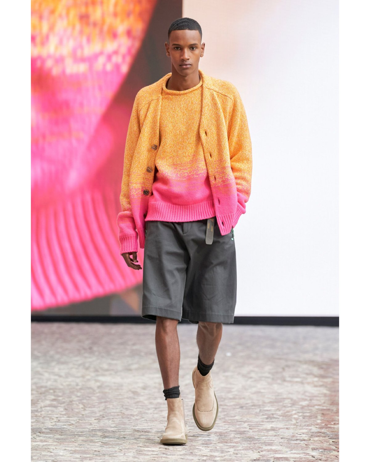 A selection of items are reversible, suggesting that this was Hermès' take on the ever-popular "gorpcore," focusing on functional without sacrificing luxury. Nichanian's use of canvas and nylon-like materials continues this theme, freshened up by its chilled color scheme, like morning dew settling on summer forest flora in full bloom. Smoky greys mimic mountain ranges and charcoal. Pops of azure and fuchsia anchored gradient sweaters, bursting with rays of orange.