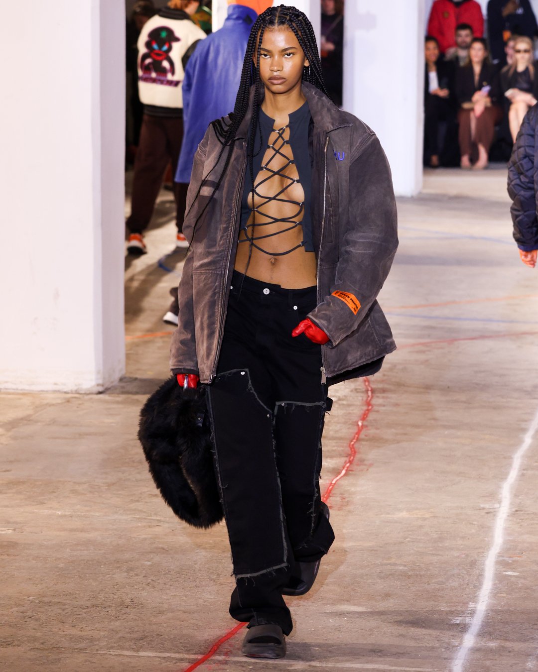 “What is this?”, “Do I keep it?”, “Low-key I think there’s dog pee on this one,” says Heron Preston as he collects trash from downtown New York streets and loads it into his Mercedes G-Wagon in a video posted on his Instagram the week of his FW23 show. The items from the street were brought back to the designer's studio to be repurposed for show invites as part of his L.E.D. practice (Less Environmentally Destructive). This was the prelude to Preston’s debut at New York Fashion Week, titled “Anything Goes”, where he had the prime time slot of the week. February 11th, Saturday at 6 pm, in an empty industrial space in Soho emerging from darkness were four hi-vis clad workers wheeling spray paint line marking applicators. As they walked around the space marking the exposed concrete floors, it becomes apparent Preston is the fourth line marker - welcome to Preston’s industrial New York streets.
