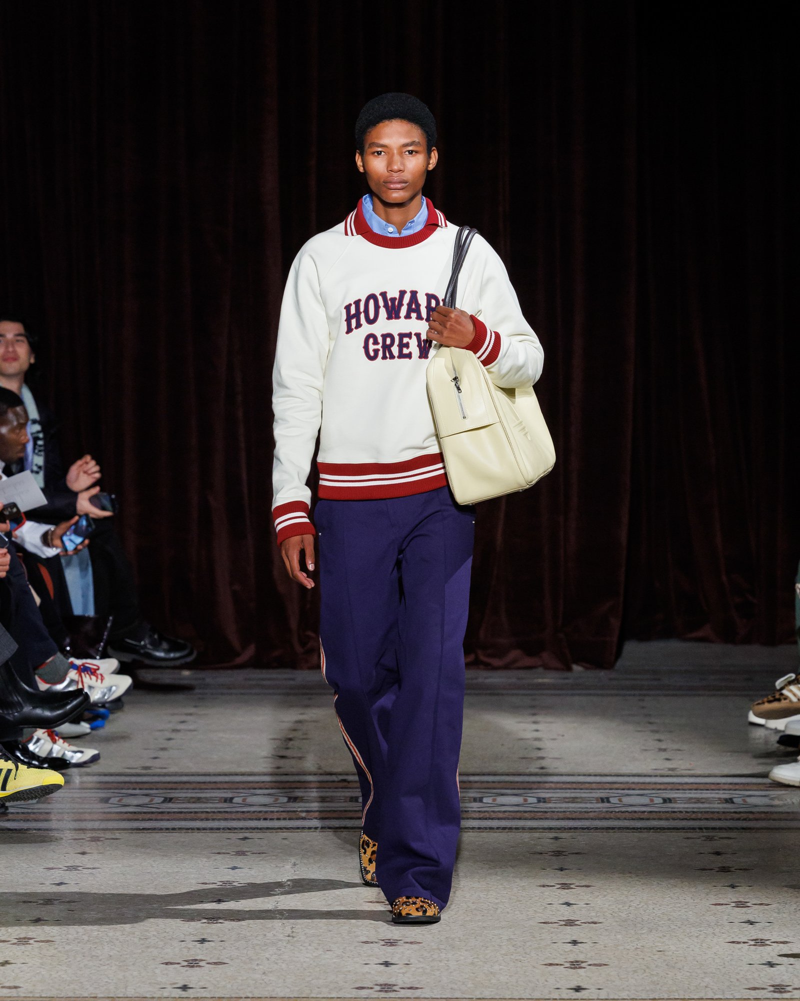 The Dream Study collection itself draws from varied aspects of Howard’s unique texture of collegiate life. Varsity blousons with stitched ‘WB’ crests and sleeveless crew sweaters nod to the legacy of the athletics department. Crewnecks emblazoned with the Howard logo draw from the school’s official iconography. Formalwear, made in collaboration with Savile Row tailors Anderson and Sheppard, evoke the iconic American tradition of homecoming. The styling of the runway show, staged in the halls of the Conservatoire National des Arts et Métiers in Paris, bespeaks Ms. Wales Bonner’s enduring fascination with the way gestures of style can give physical form to abstract ideas and feelings. Shirttails, cuffs and collars overflow from beneath the jackets and sweaters that entomb them. The hems of voluminous pants and jeans skim the ground just so. What we’re left with is an evolved perspective that sidesteps the usual manicured preppiness and ossified visions of collegiate style, an elevated vantage point that drives it towards a more sensuous, cerebral and refined realm.