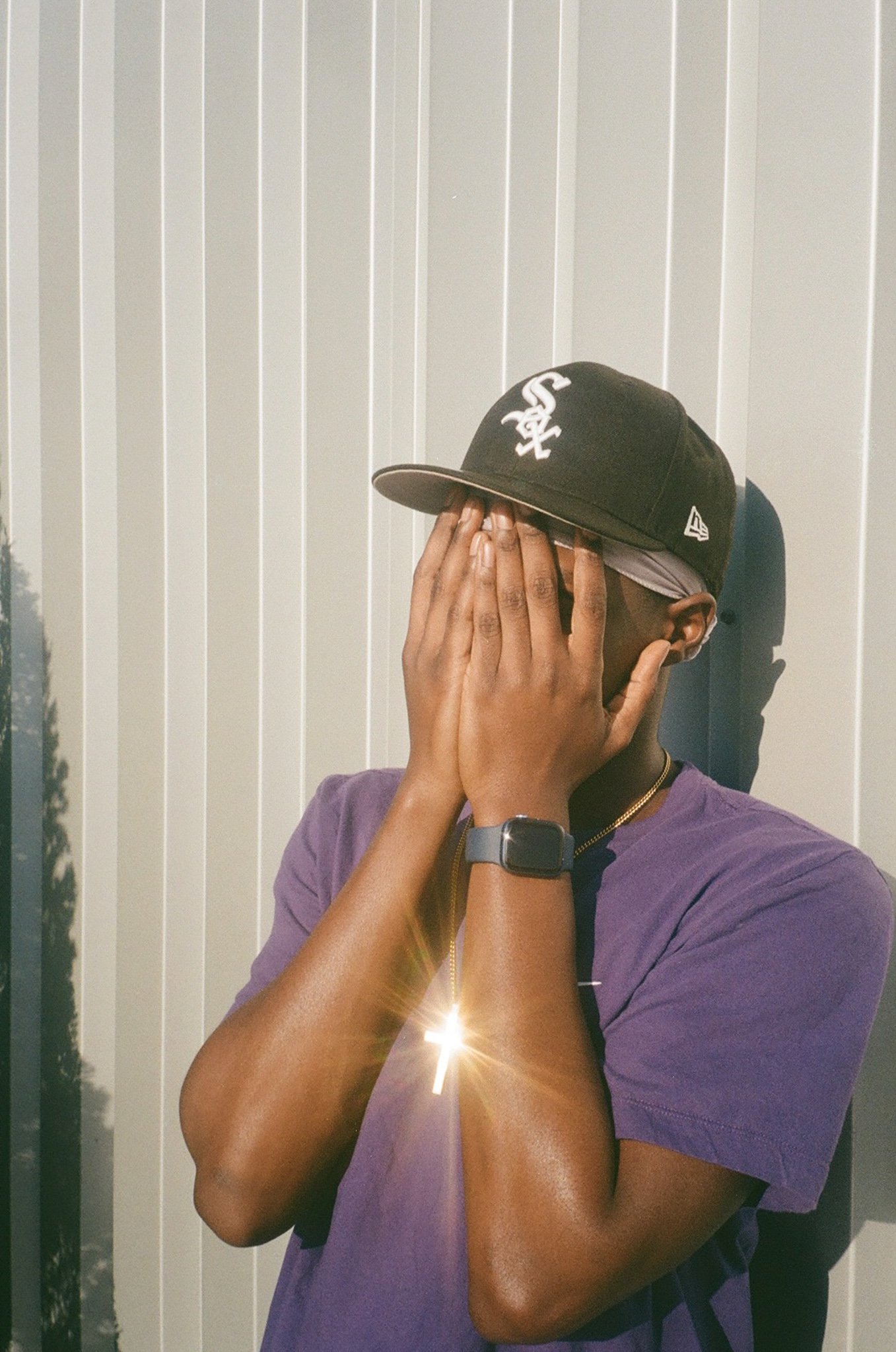 A deep sensitivity and sense of responsibility emerges as one flips through the materials in the publication, which is as rich and evocative as the collection itself. A limited edition newsprint publication with multiple inserts, it includes submissions from students past and present, reprints of archival materials and newly created texts and images. On one page, a testimonial from ambient music pioneer and Howard alum Laraaji; on another, a poem by the great American author Toni Morrison (Class of ‘53). A standout amongst these contributions from past and present students is a stunning photograph by Maiz Lawson, who graduated from the film program last year. In it, a young man, sporting a purple t-shirt and a black White Sox hat, covers his face with his hands, his neck draped in a gold rope chain with a large cross pendant. The cross catches the blinding light of the sun, turning a gesture of spirituality and style into an image of exaltation.