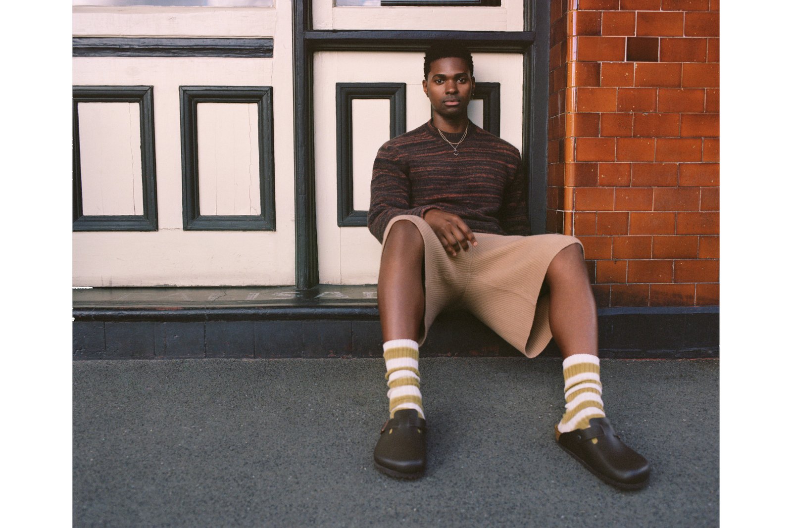 Johnny wears sweater Mr P., t-shirt Mr P., shorts Dries Van Noten, socks Mr P. and sandals Birkenstock.