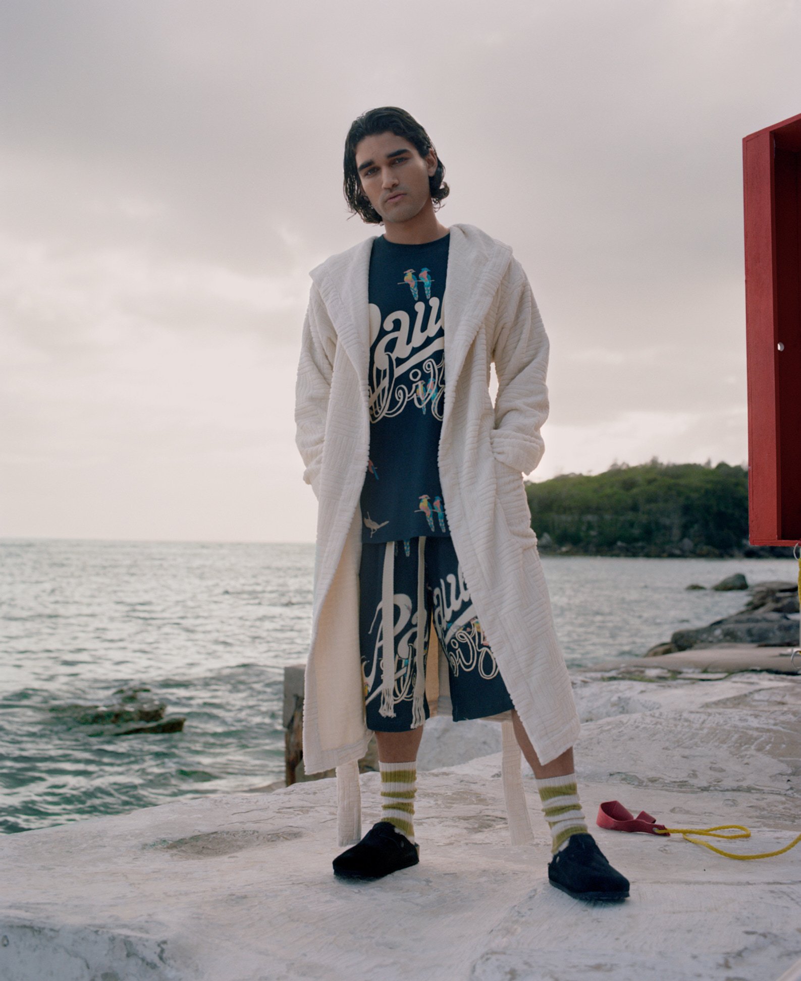 Josh wears BOTTEGA VENETA Cotton-Terry Hooded Robe, LOEWE + Paula's Ibiza Printed Cotton-Jersey T-Shirt, LOEWE + Paula's Ibiza Wide-Leg Printed Loopback Cotton-Jersey Drawstring Shorts, MR P. Ribbed Tie-Dyed Striped Cotton-Blend Socks and BIRKENSTOCK Boston Shearling-Lined Suede Sandals all available at MR PORTER.