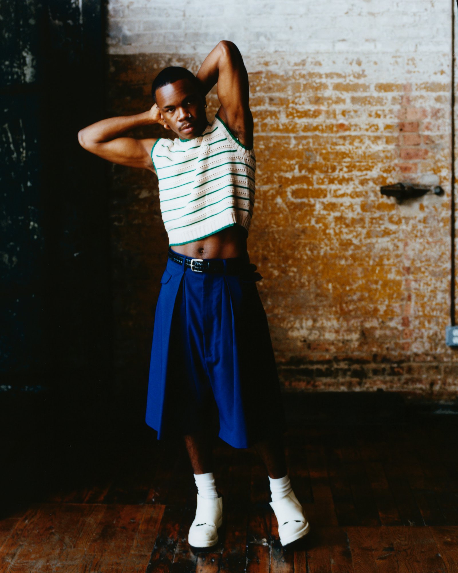 Taofeek wears top JEAN PAUL GAULTIER. Leather pants HEAD OF STATE. Jewelry Taofeek’s own.