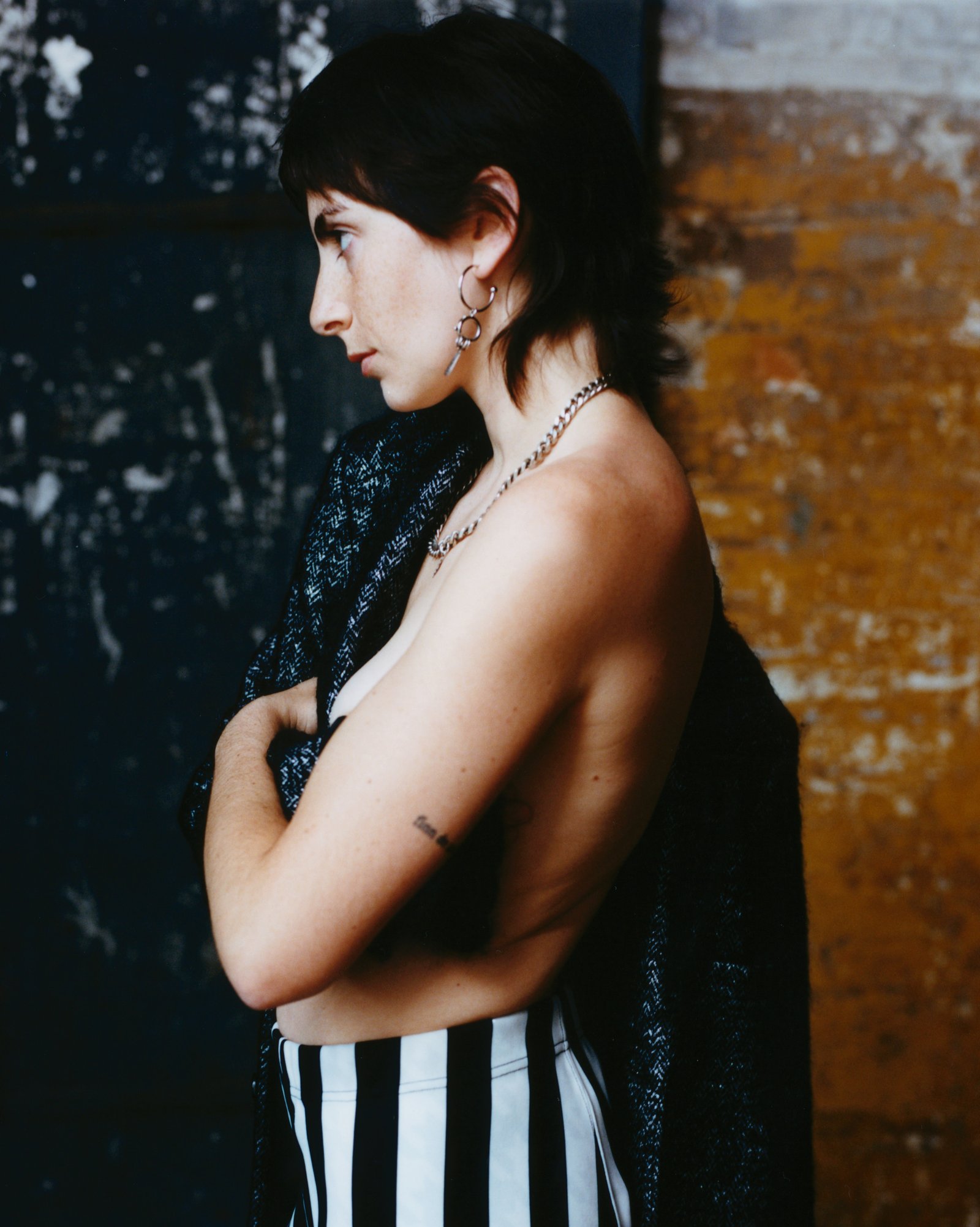 Emily wears jacket and pants COMME DES GARÇON HOMME PLUS. Earrings and necklace Emily’s own.