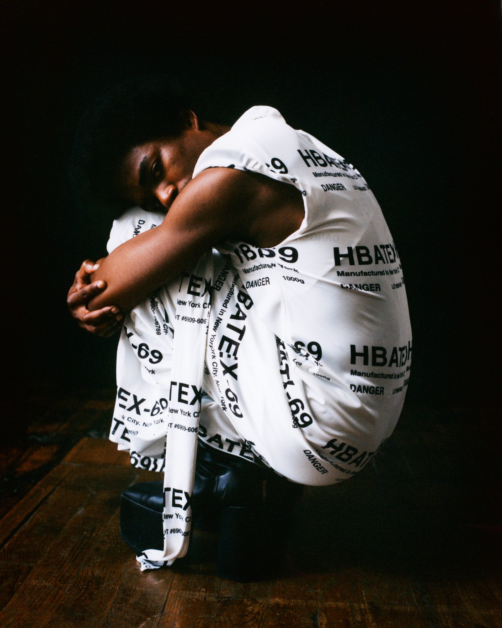 Guarionex wears hoodie VETEMENTS courtesy of stylist’s studio. Jumpsuit LOEWE.
