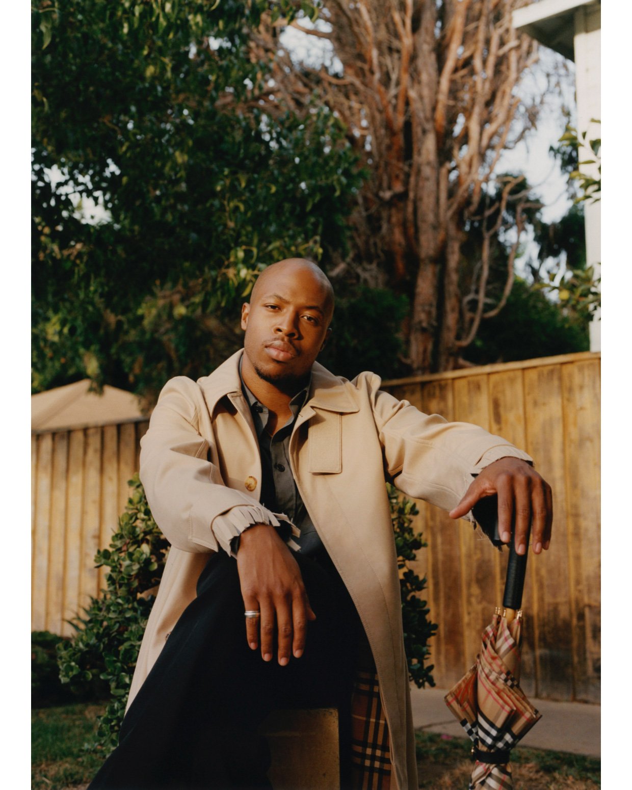 Justen wears coat, shirt, trousers and umbrella BURBERRY. Ring Justen’s own.