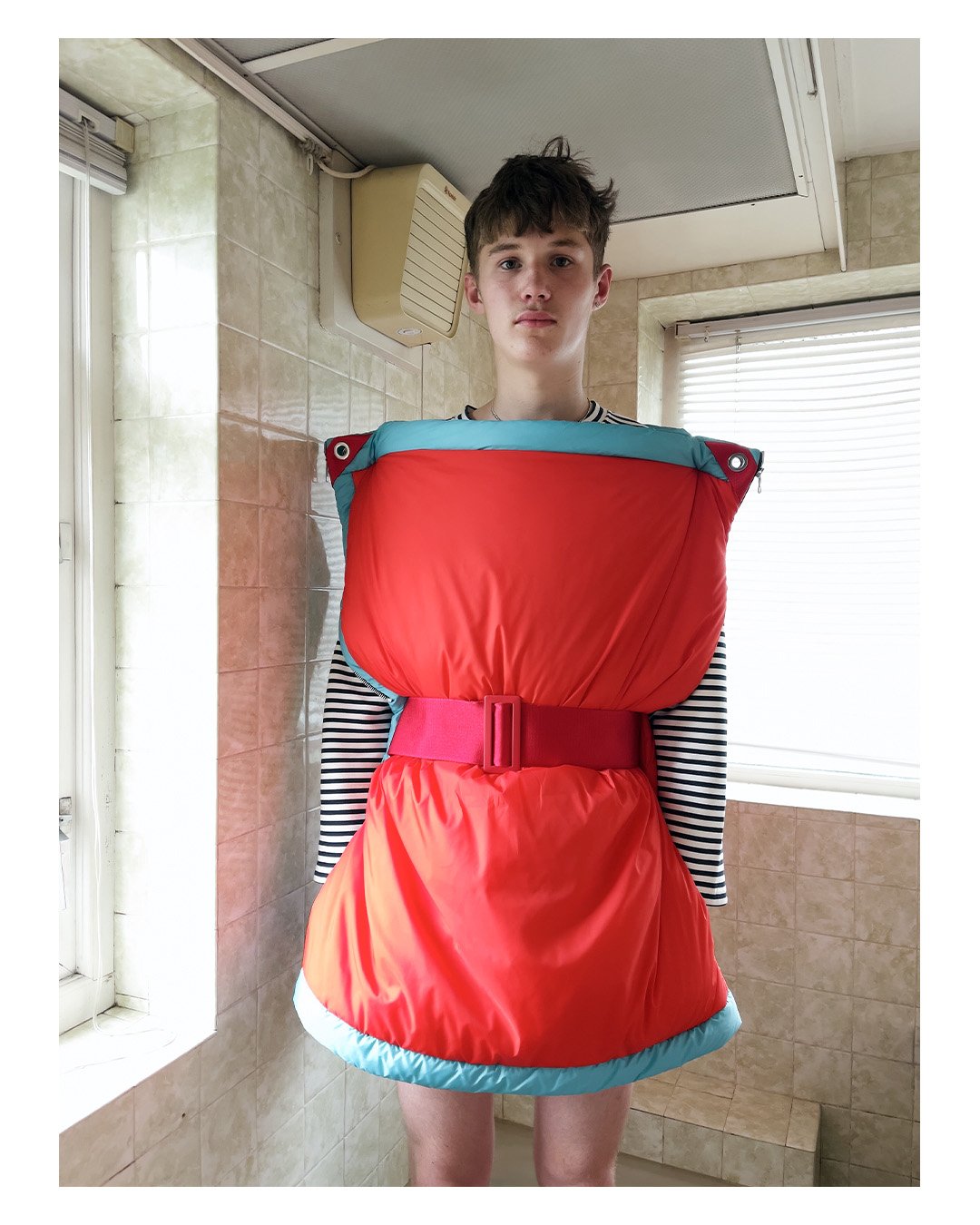 Featuring a predominant motif of gargantuan strawberries and flowers on nylon playsuits, Anderson calls back to the early days of quarantine lockdown, reimagined with less unease but more opportunity. A puffy, rectangular top belted to the waist calls back to one of the pandemic’s first and perhaps most bizarre viral trends, the #QuarantinePillowChallenge which saw users turn pillows into dresses. This cheerful flirtation with dressing and form that can only happen in the privacy of the domestic space is what Anderson aims to explore.