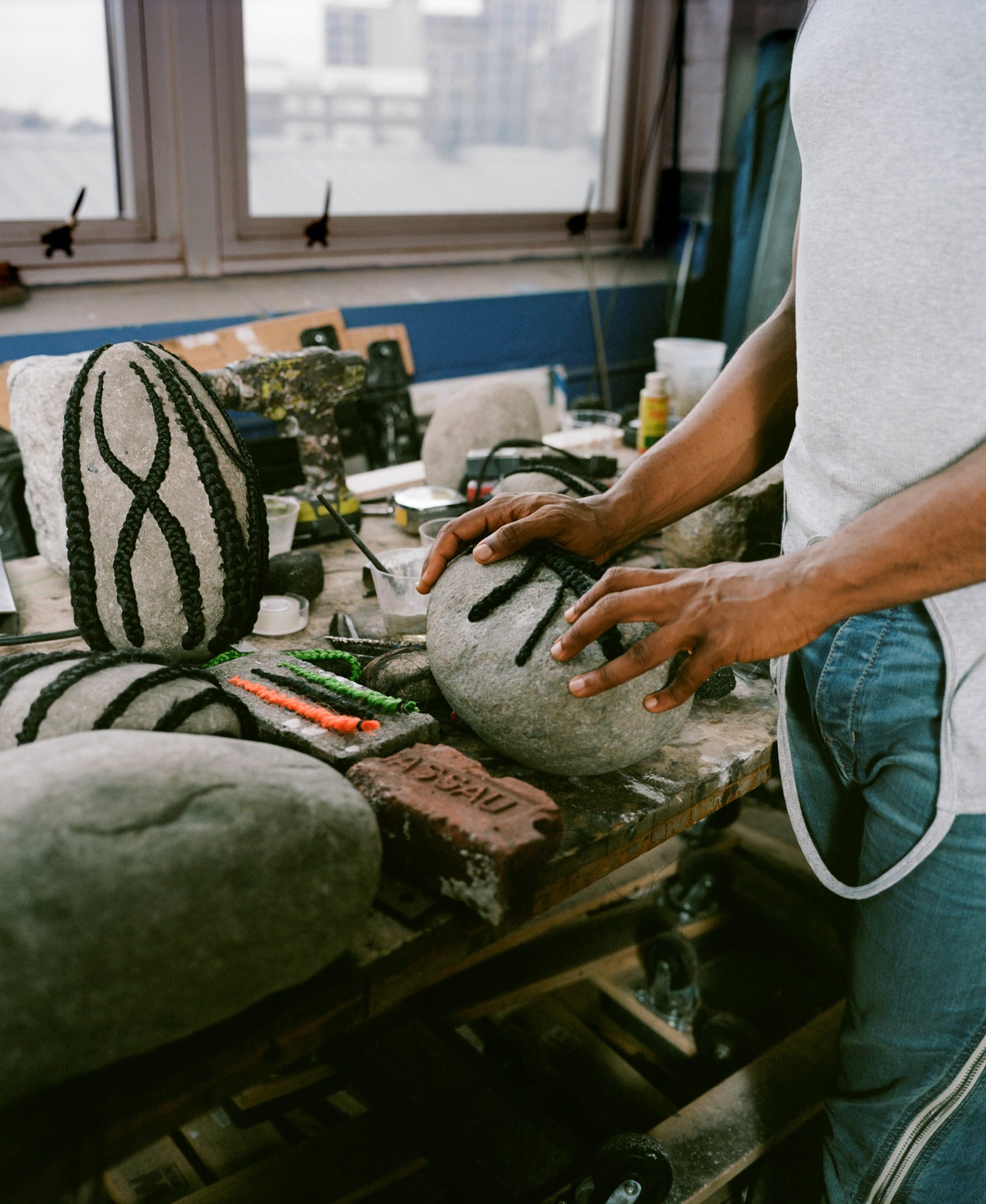 Kiyan Williams: I’m in Brooklyn, along the East River waterfront, where my studio has been for the last three years. It’s an old converted warehouse that holds the residue of its industrial past. The neighborhood still has the feeling of a place where things are made, and it remains an important site of entry and exit for maritime travel. Being able to look out onto the water feels energizing. These are elemental and geographic markers that ebb and flow into my own work. It’s a grounding place for my practice. It has recently become a site of inquiry, one of the many places I visit to collect materials for my work.