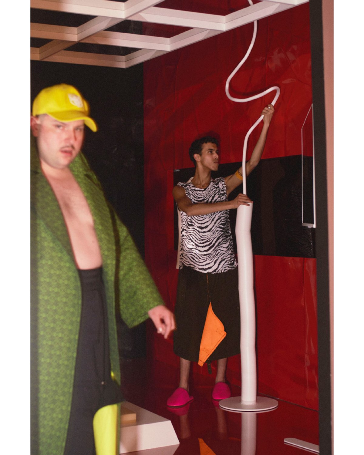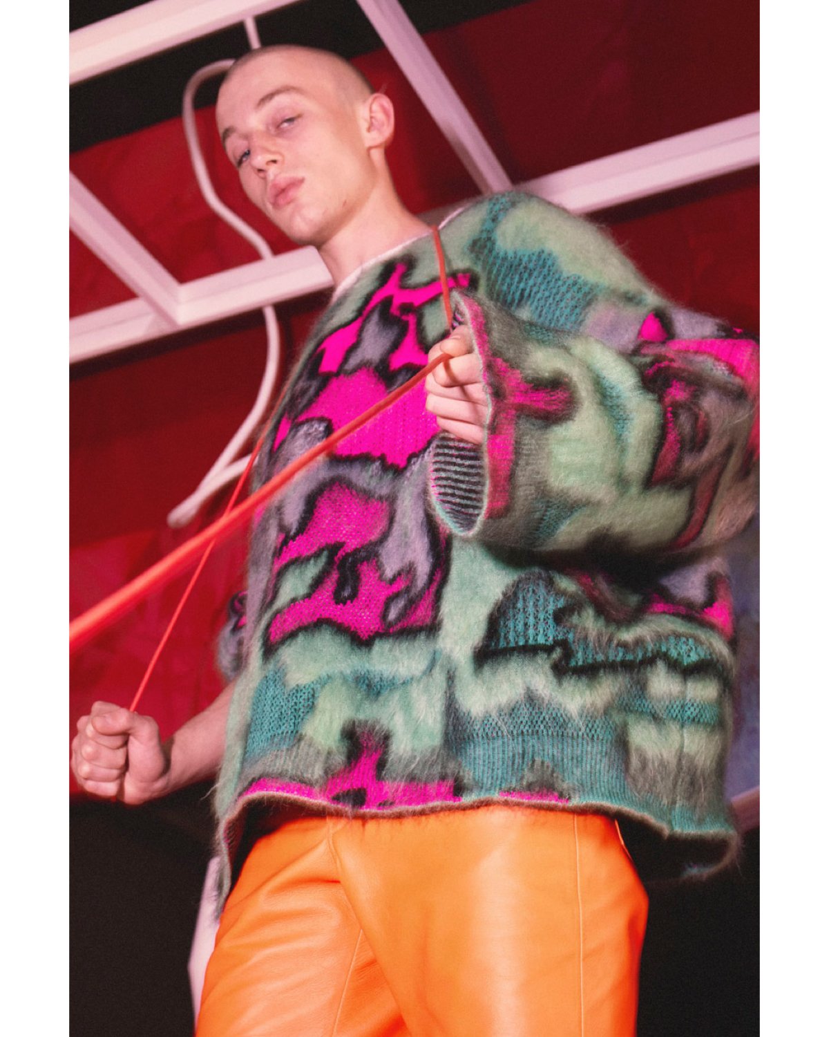 An intricately printed trench in green and black makes a return to Loewe with matching cinched moon boots. The scooped backplate of a glistening black jacket refracts prismatic beams from club lights. Layered, microscopically knit mesh sets in classic rave colors swaddle the silhouette in a gauzy glow. Anderson experiments with cactus leather, a glossy, eco-friendly alternative for the traditional textile, asserting that his progressive vision doesn’t stop short at climate concern. Cable knit cut-out sweaters and dresses flirtatiously reveal breasts, thighs, and layers—a zebra-print glitter tunic and shorts sparkle in orange hues and classic monochrome—a russet playsuit pools around the body, fastened by horn buttons in a rib-knit. A heatmap mohair sweater in bubblegum pink and turquoise steals the show with orange leather pants, sure to keep you warm on your morning walk home from the rave, birds happily chirping above.
