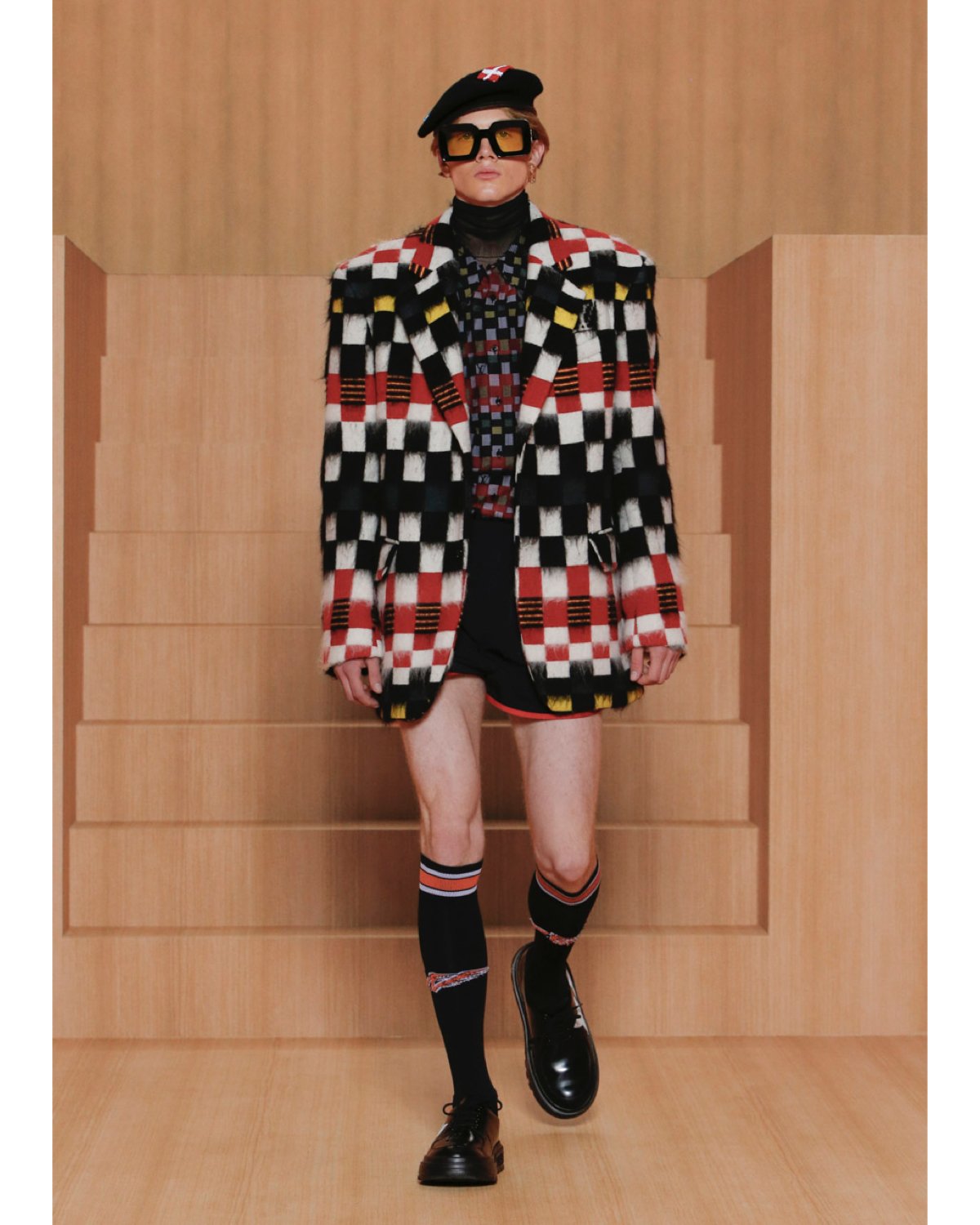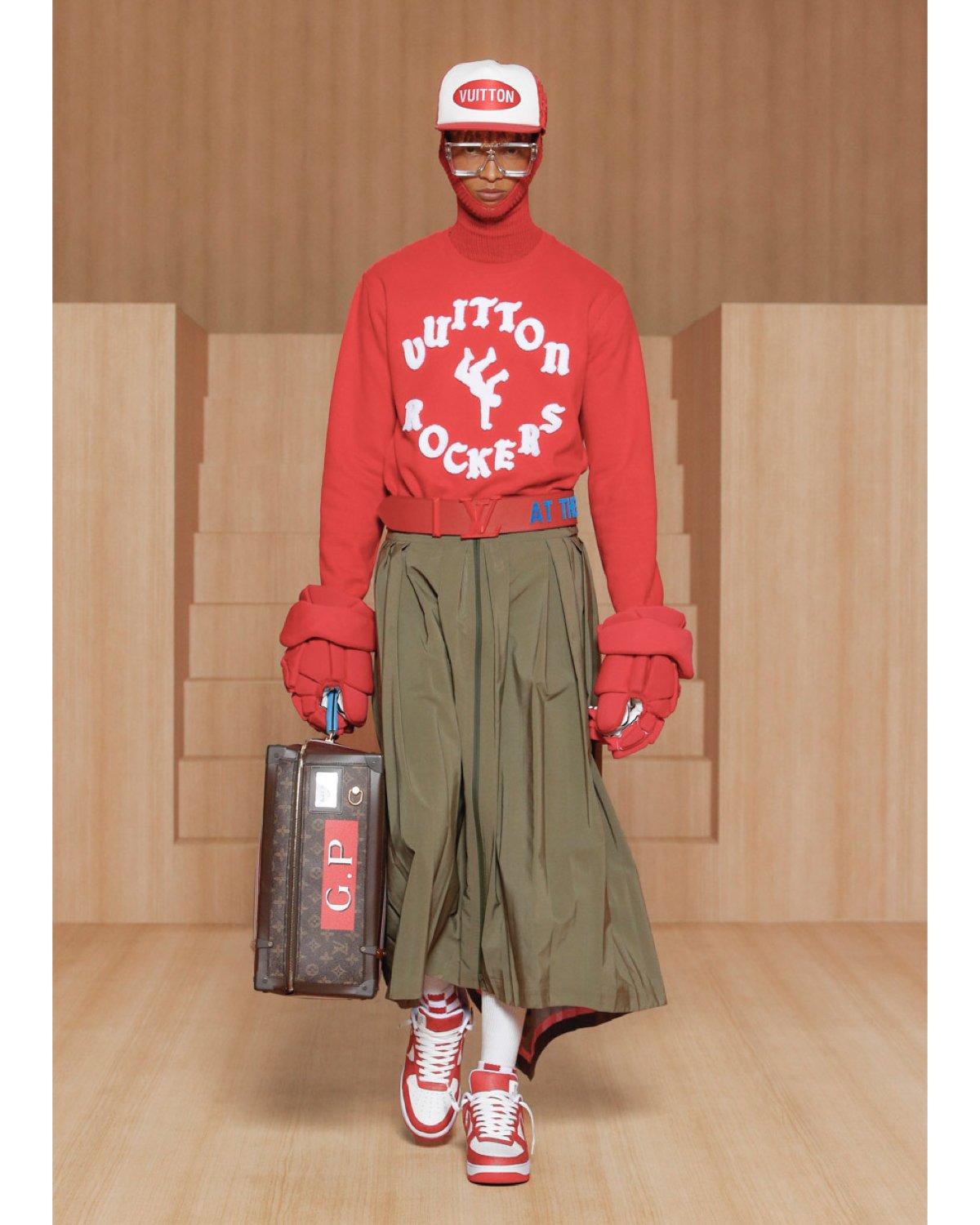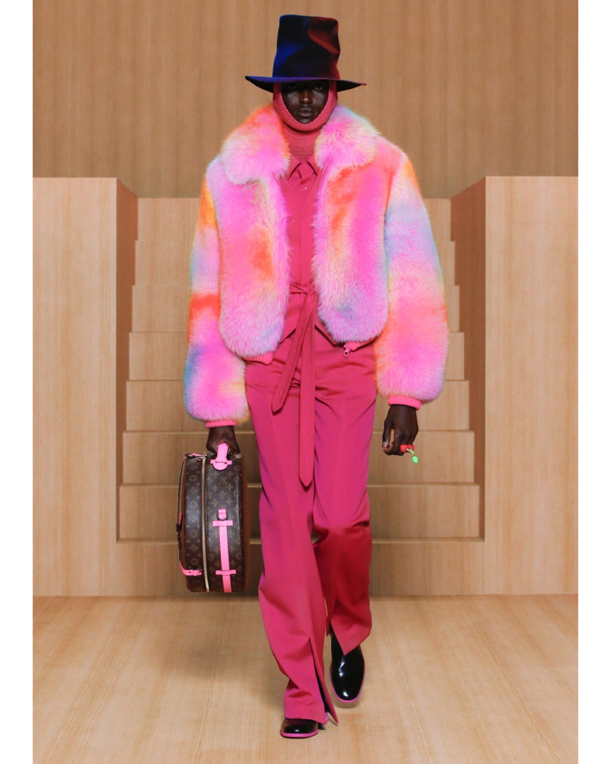 This season, the designer plays with vibrant neon gradients on jackets, bags, mini trunks and furs. LV’s famous monogrammed denim makes a comeback in slouchier styles, shredded and baggy, some adorned with a bright pink graffiti tag across the lap. Tailoring is given the same rainbow treatment, reaching its peak with a glossy, short suit inspired by Y2K-era rave flyers. A lustrous, silky suit with an embroidered nature print closes out the show. Faces are obscured by checkered balaclavas, hoodie drawstrings pulled taut, massive ear muffs or crushed top hats. Plaid and checkerboard make a regular appearance throughout, chicly paired with a matching beret or sweeping the floor in drapey lengths.