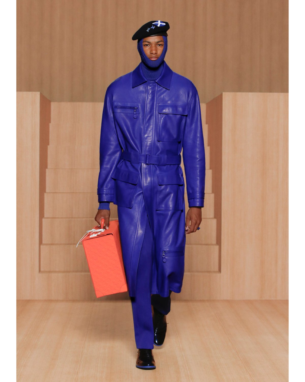 The variety of textures, colors and silhouettes across the collection is stunning. Monochromatic suiting dazzles the eye in rich cobalt blue, meanwhile neutral beiges and blacks are punctuated with bursts of neon detailing, becoming a signature of Abloh’s Louis Vuitton. An illusory black suit plays with shape as white spray-paint mist accentuates the figure. Hockey gloves and a knitted jersey fit for the world’s most luxurious arena are a motif throughout. The sportswear inspiration is carried through with cricket-style padded shinguards and knee-length soccer socks. Plush furs are given a dynamic shape with dayglo dying. A trucker jacket and matching trousers reimagined in silver foil call back to the silver space-age metallics of Abloh’s first collection for the legacy brand. A scalloped trench coat and floral motifs translate feminine concepts to add depth and intrigue to menswear.