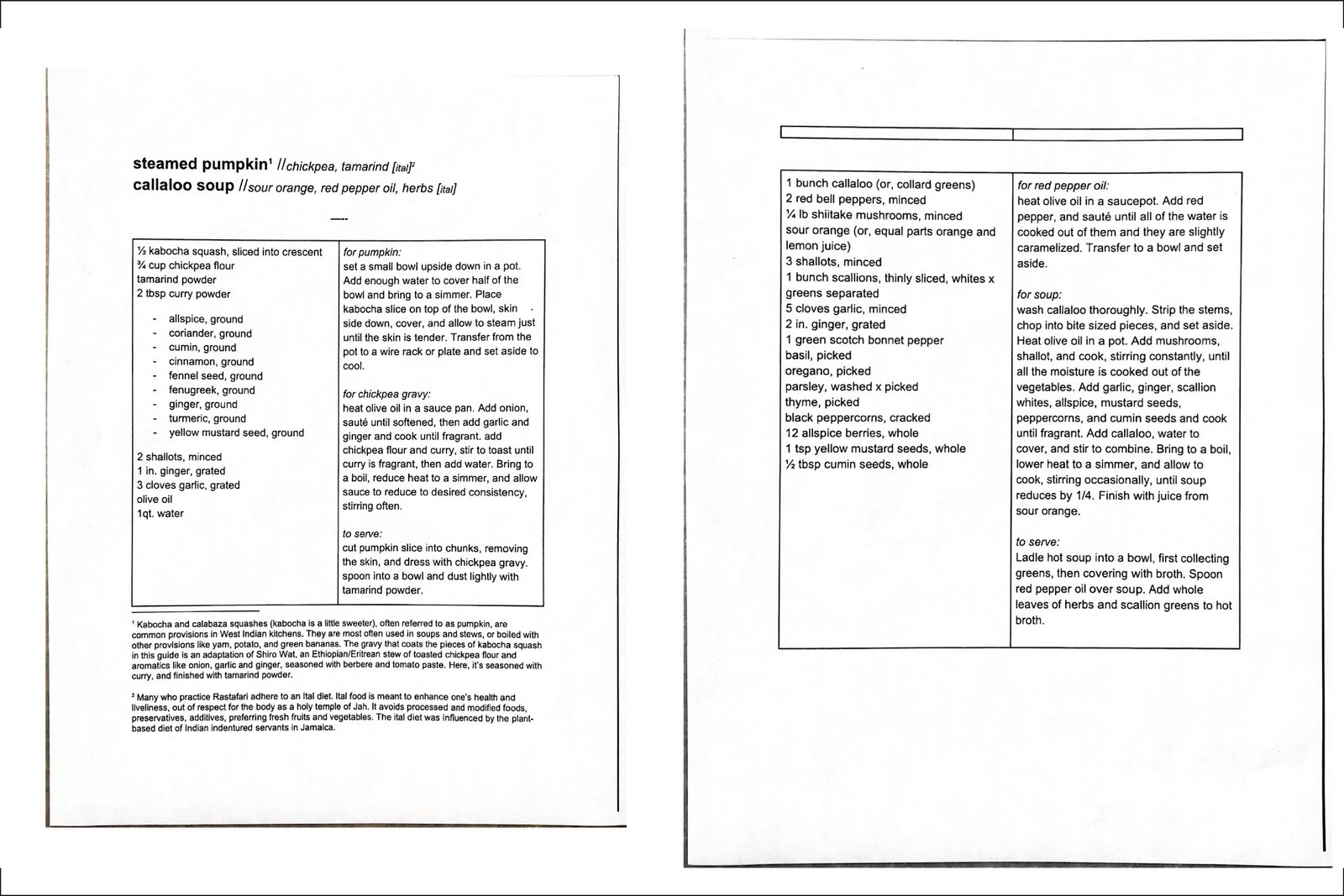 Nathanael Cox: Dominique mentioned taking inspiration from Ethiopian churches. There is an important cultural connection between Ethiopia and Jamaica through Rastafari and Ital diets. I decided to make Ital dishes. Both recipes are imagined to be served together. It is a culinary adaptation of Ethiopian shiro wat. There is a back and forth between the recipes from Jamaica to Ethiopia to Jamaica and then back to Ethiopia. The Ital diet itself was influenced by indentured servants from India which is something that is also a part of Jamaica’s history. Ital food is a post-slavery thing.
