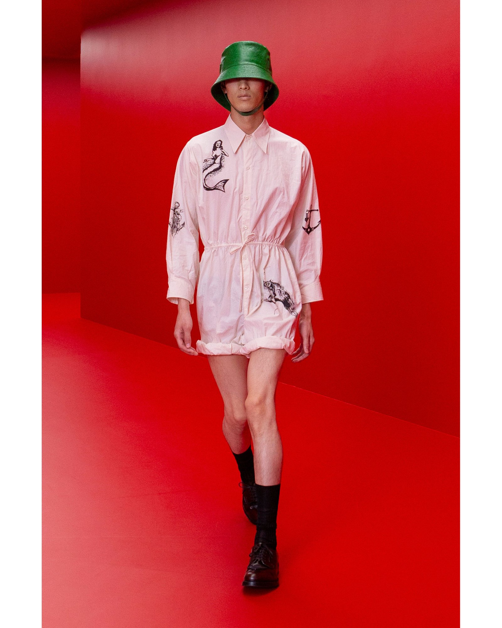 A global yearning for a more carefree and less indoors summer has been answered by Prada and Simons; there is almost no look that doesn’t feature the glaring bareness of the male thigh. From short shorts to rolled-up rompers, any chance has been taken to get beach-ready. All feature prints that vary from nautical tattoo-like motifs to bold 50s style stripes and patterns.