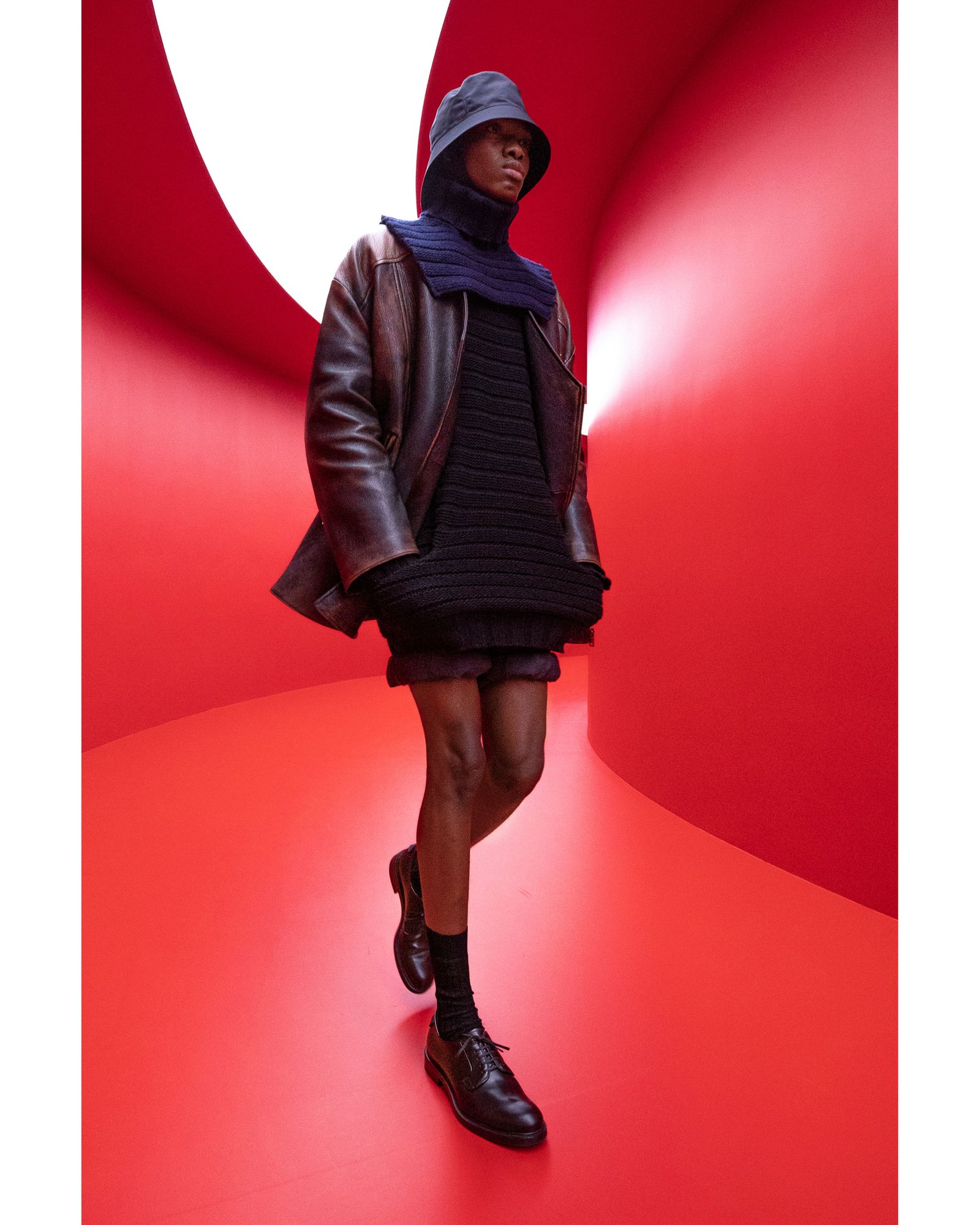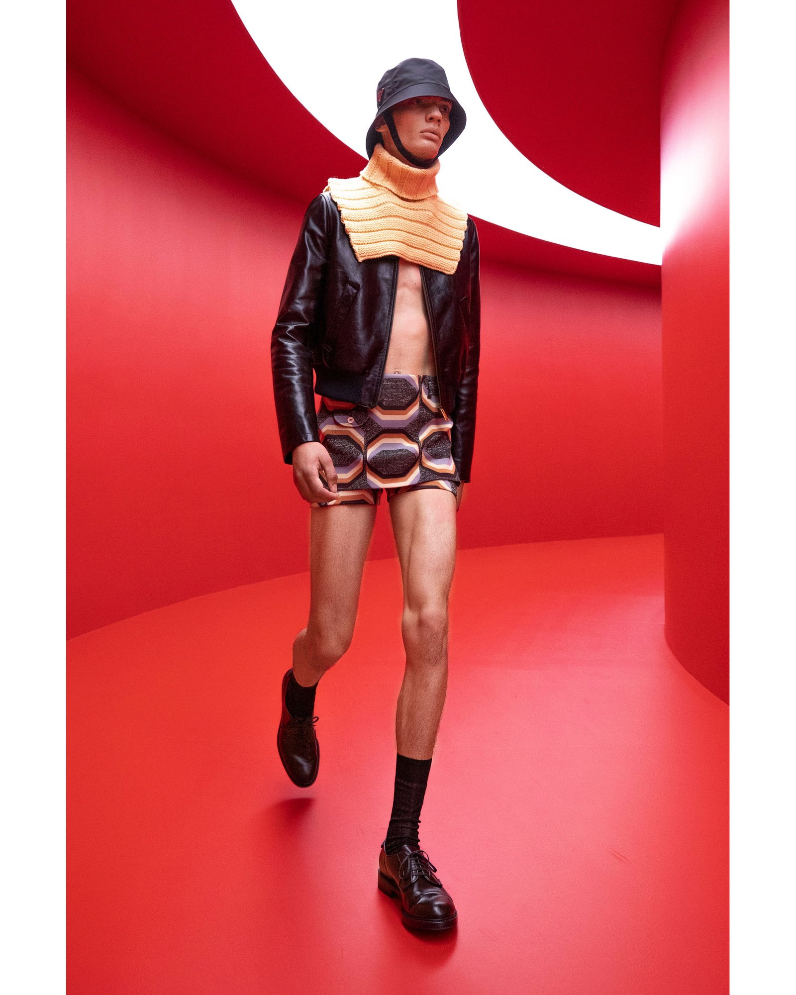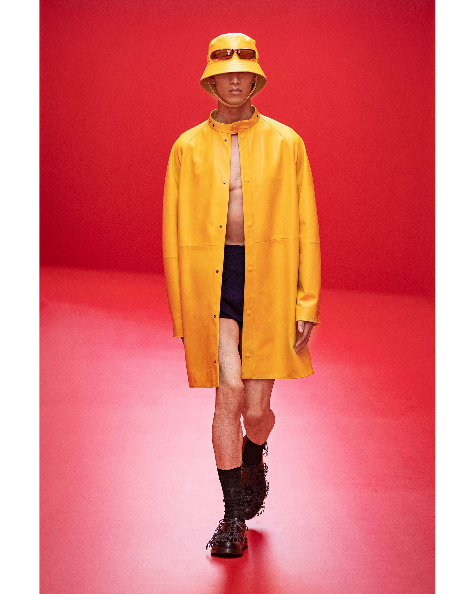 Overall the show highlights the pairs’ natural talent for balance. From the location, juxtaposing the idyllic Sardinian coastline with the bold futuristic scarlet corridors. Brightly colored overcoats, immaculately draped over dark short shorts. Textural leather jackets with the sterility of their glossy backdrop. It all plays to the impeccable pairing that we are witnessing between Prada and Simons.
