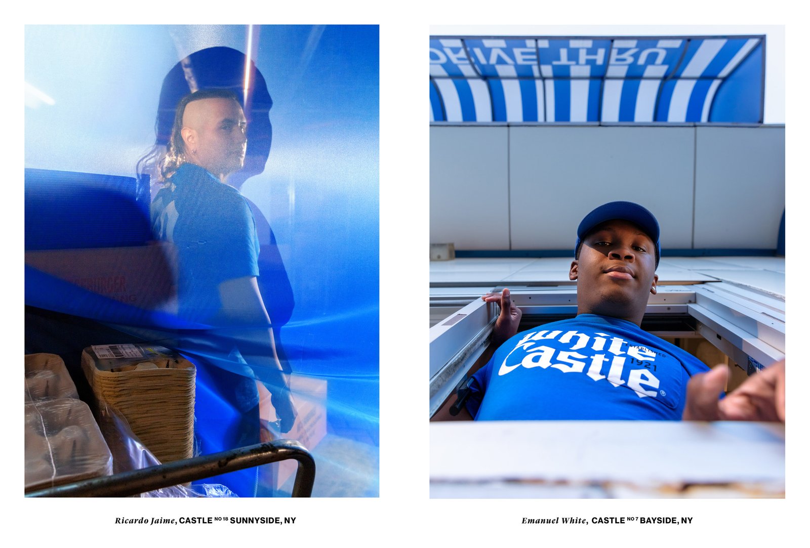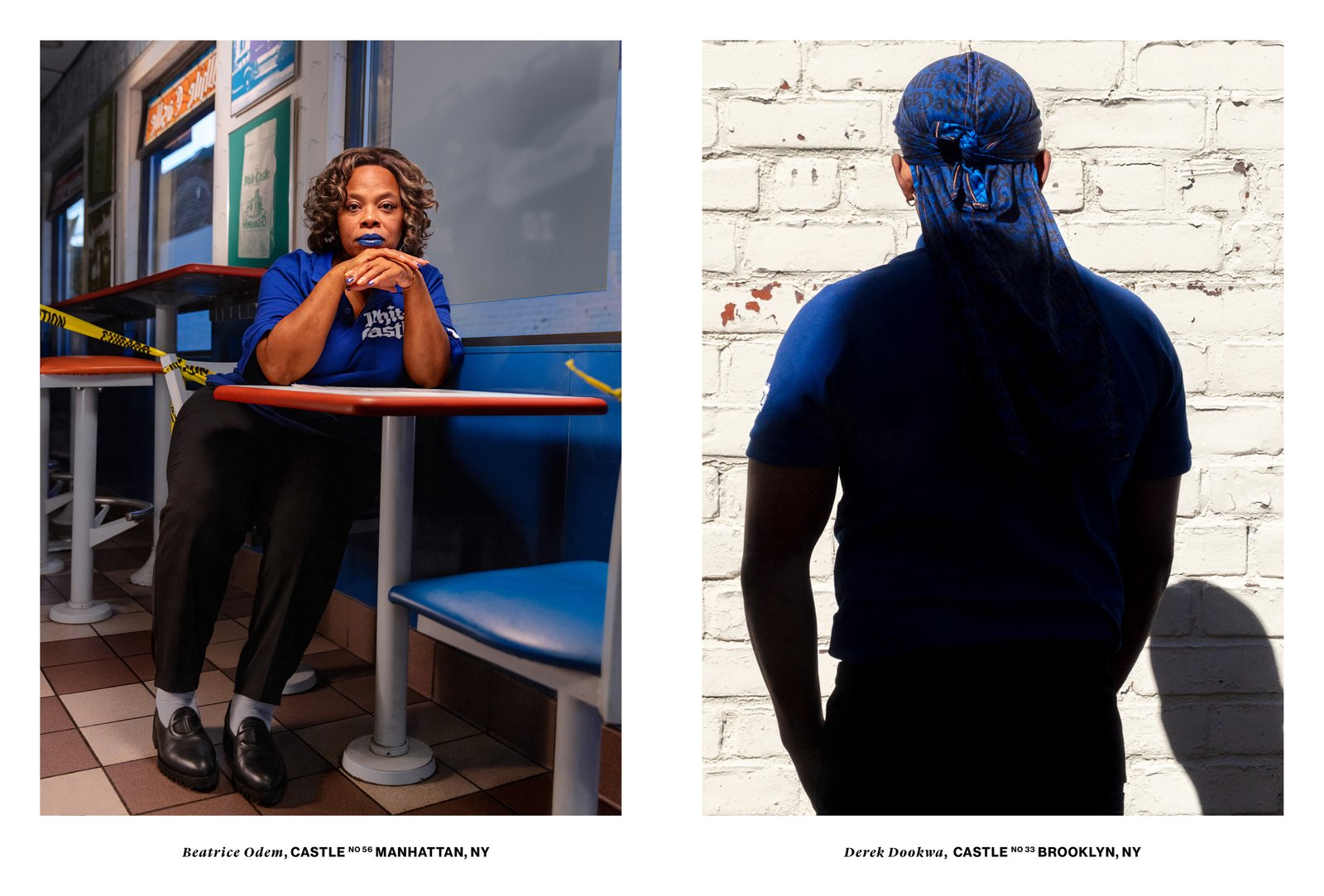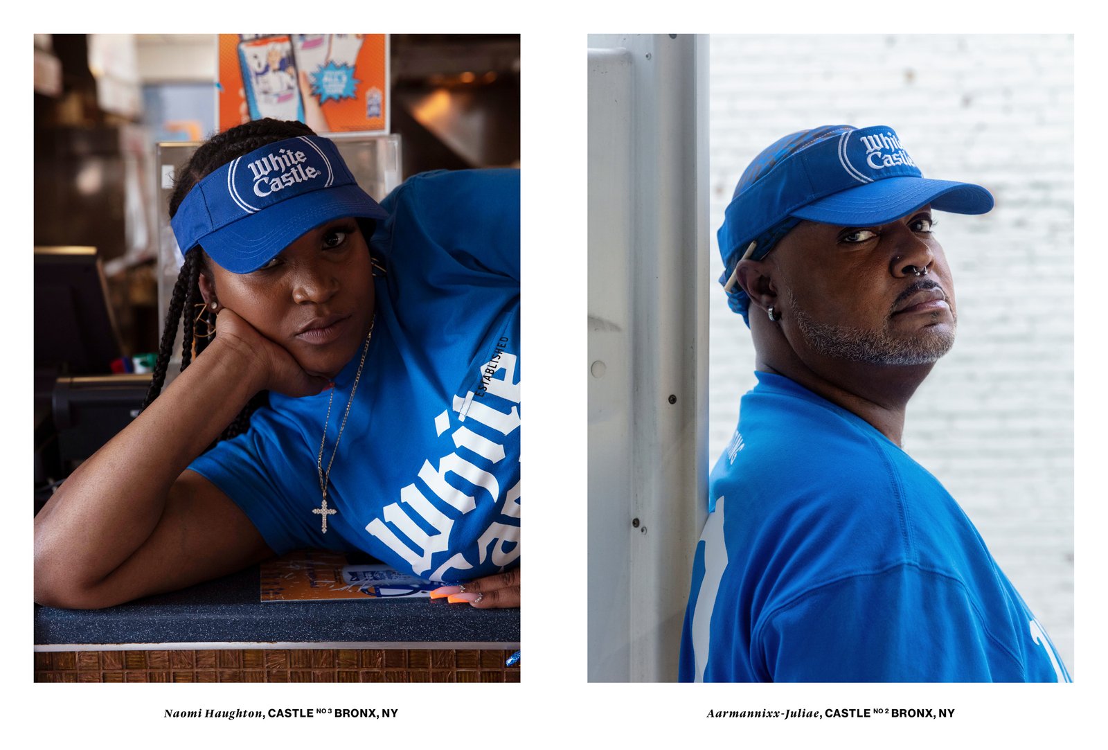 The new uniform marks the first time White Castle has offered a durag as part of the chain's uniform, and to our knowledge, the first of any American restaurant's uniform. Artist Elliott Jerome Brown Jr. photographed White Castle team members in the new uniform across New York City from the Bronx to Queens, where Telfar Clemens himself was born.