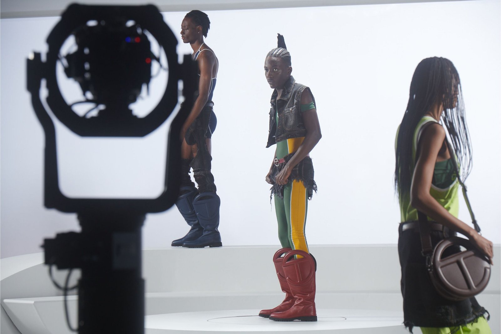 The genius of Telfar TV continued with “PERFORMANCE” – TELFARTV: The Movie (The Fashion Show) "WOW"; a film screening debuting the last six months of Telfar TV, as well as a live presentation of their never before seen post-seasonal collection. The elasticity of the streaming platform was shown and proven throughout the entire show. Within the first five minutes of the show, we are placed in the Telfar broadcasting room; where a contestant from a screen was selected to spin a wheel to choose a bag color they would receive. This small moment shows us the integrity of Telfar keeping up with its motto of accessibility and being mindful of its audience. It is a reference of a communal reference. Telfar is practicing community and commune.