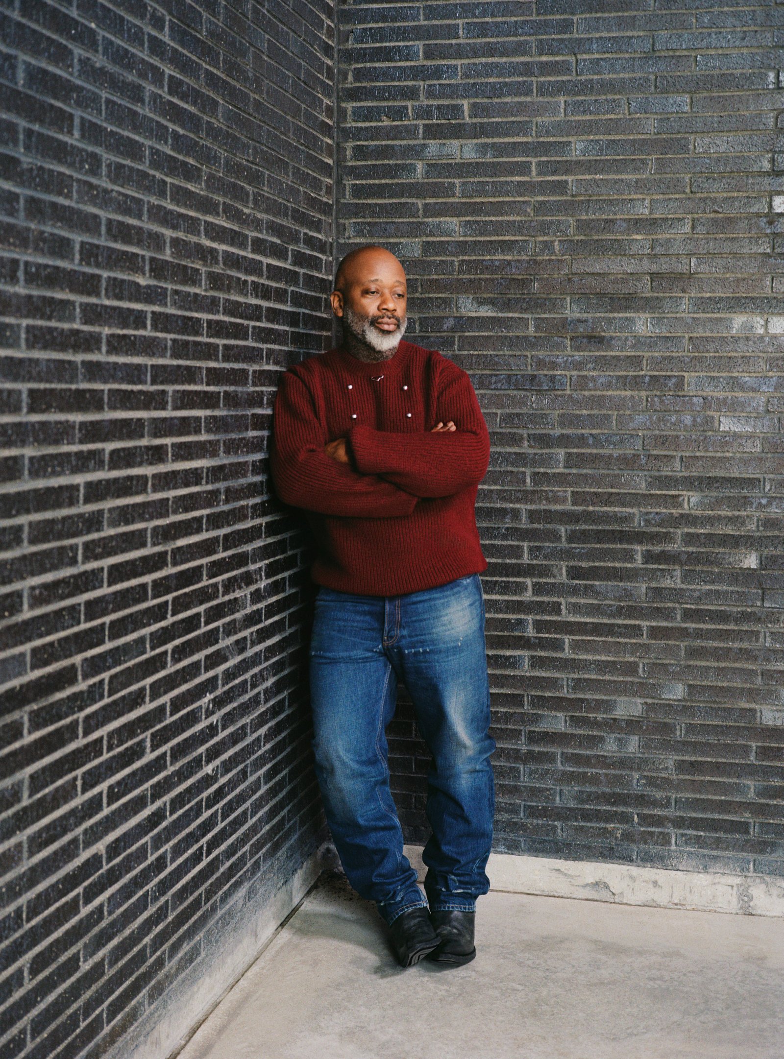 Theaster wears sweater, jeans and boots PRADA.