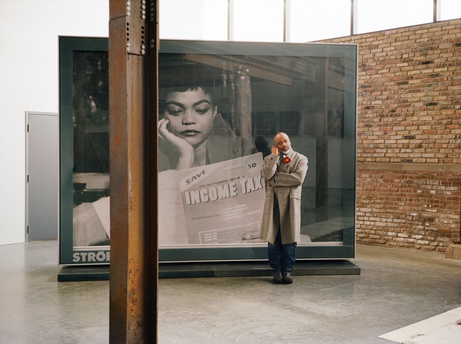 Justsmile Issue 7 cover featuring Theaster Gates. Coat, t-shirt, jeans, boots and brooch PRADA.