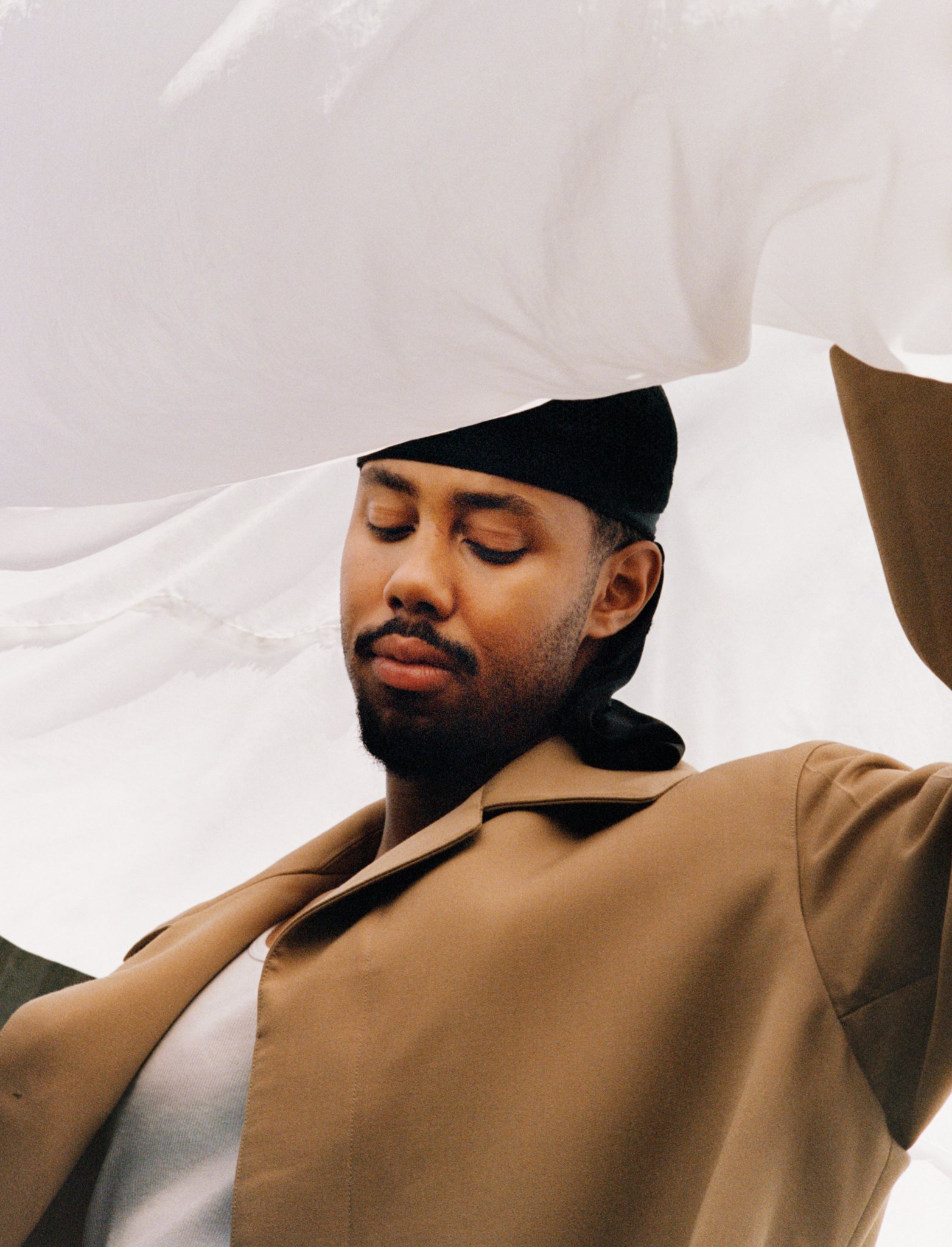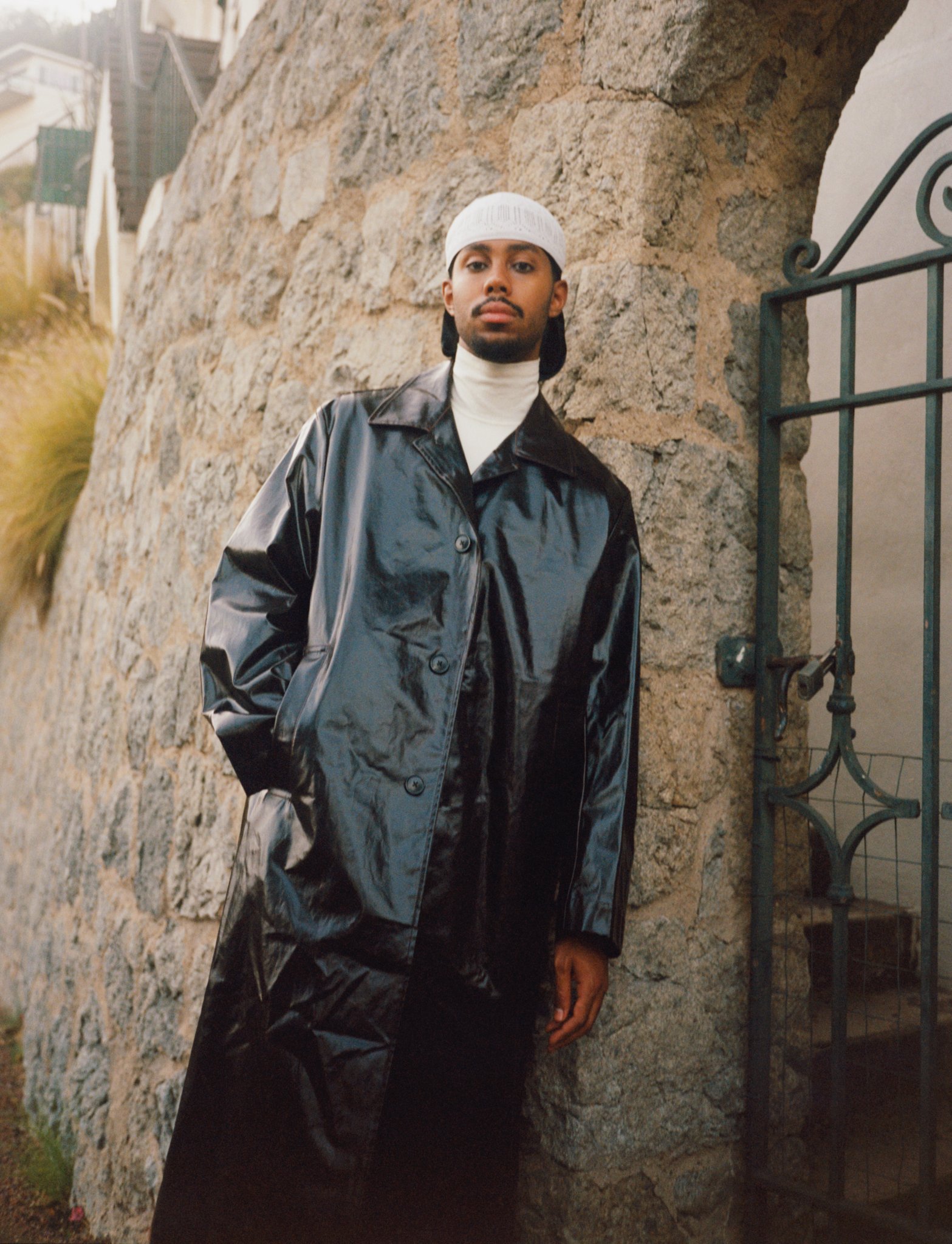 Mustafa wears coat DRIES VAN NOTEN. Turtle neck BOTTEGA VENETA. Kufi and durag Mustafa's own.
