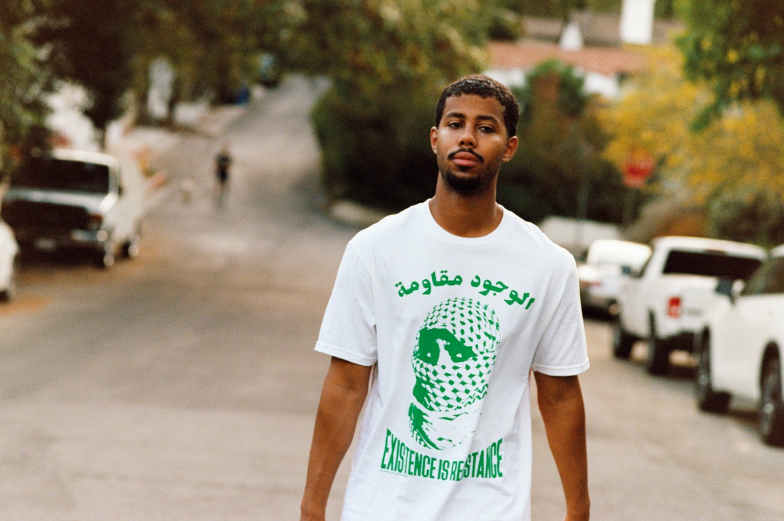 Mustafa wears t-shirt PALESTINE JUSTICE EFFORT. Jeans LOUIS VUITTON. Sneakers GIVENCHY.