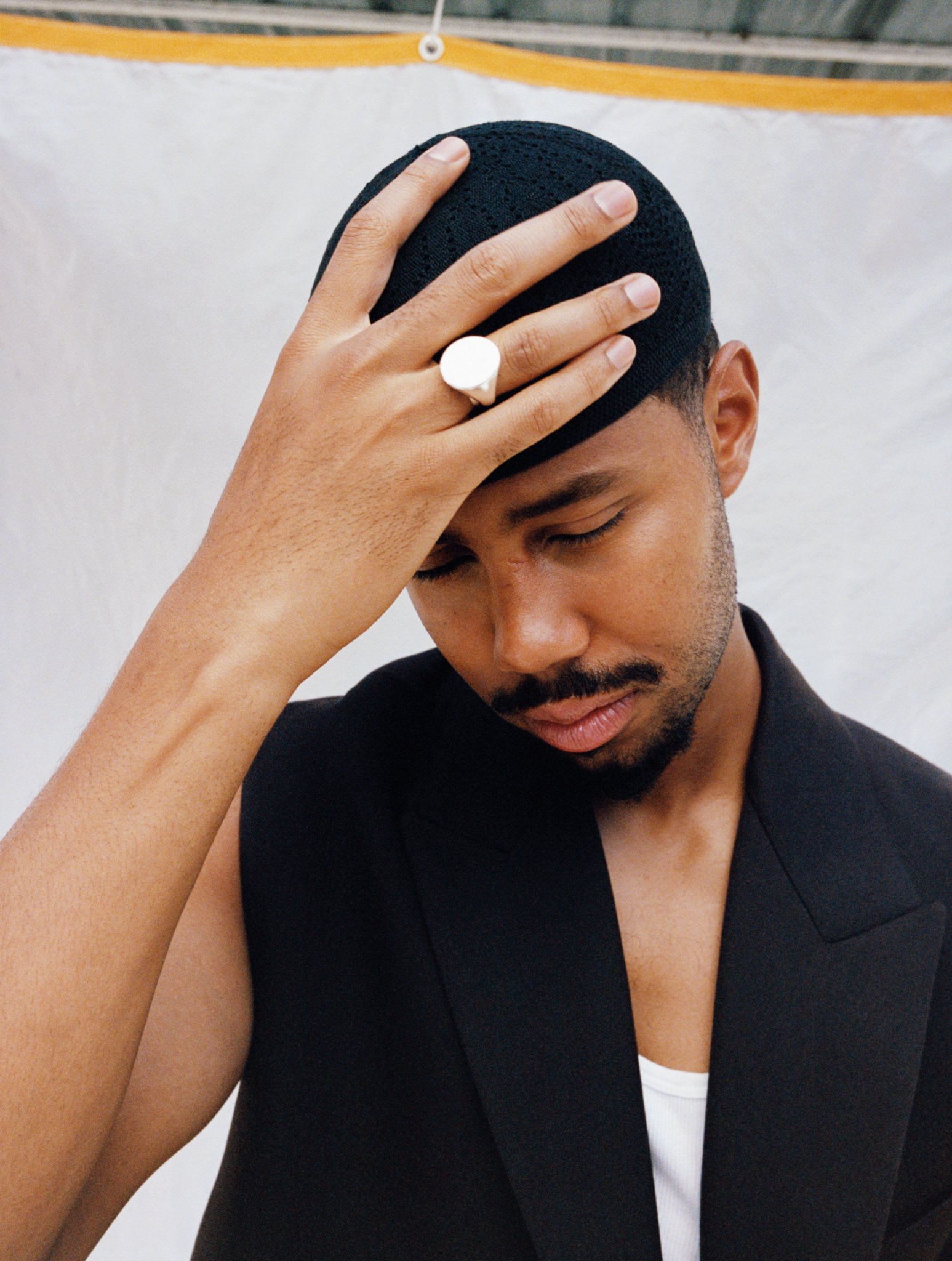 Mustafa wears jacket GUCCI. Tank top CALVIN KLEIN. Durag and ring Mustafa's own.