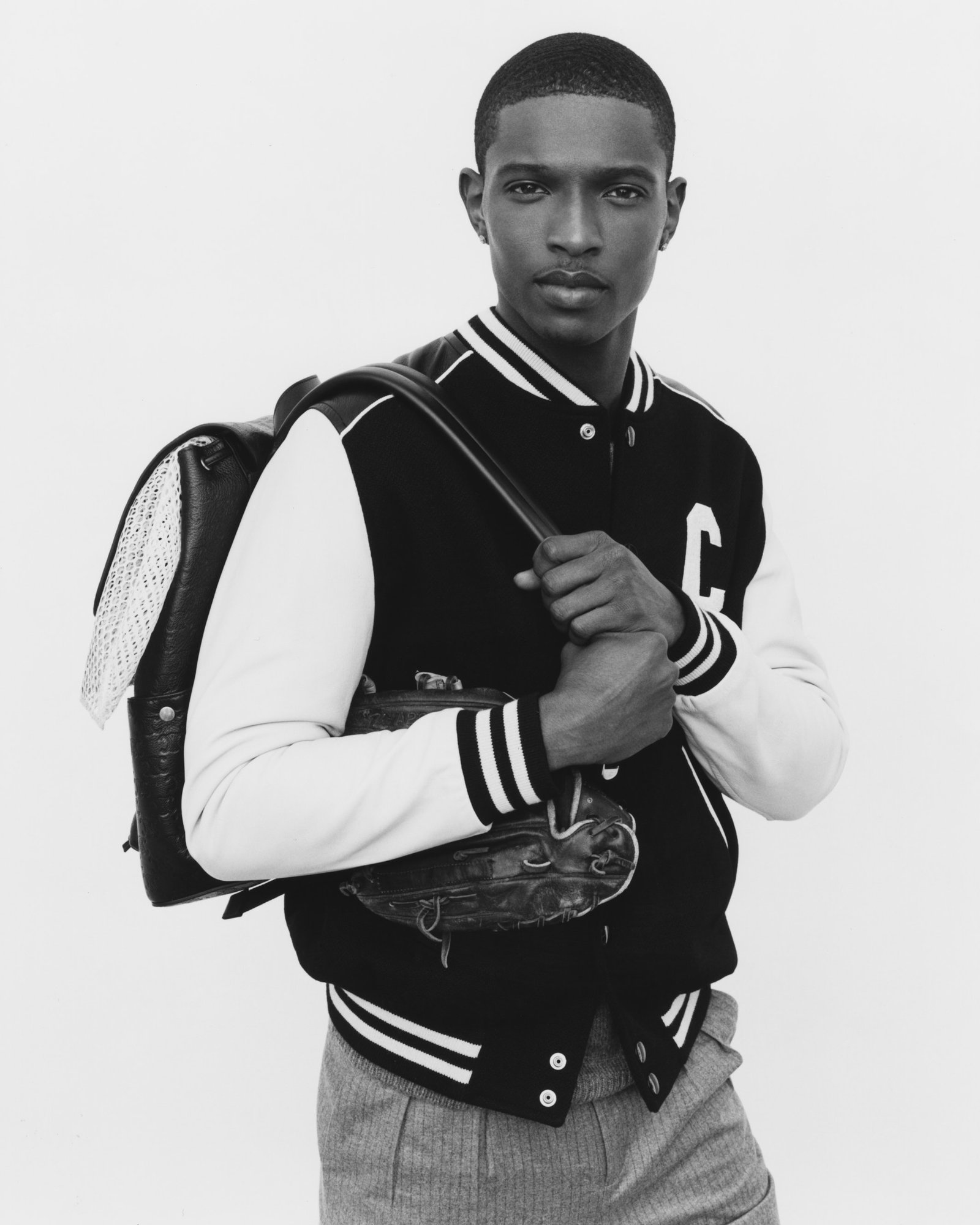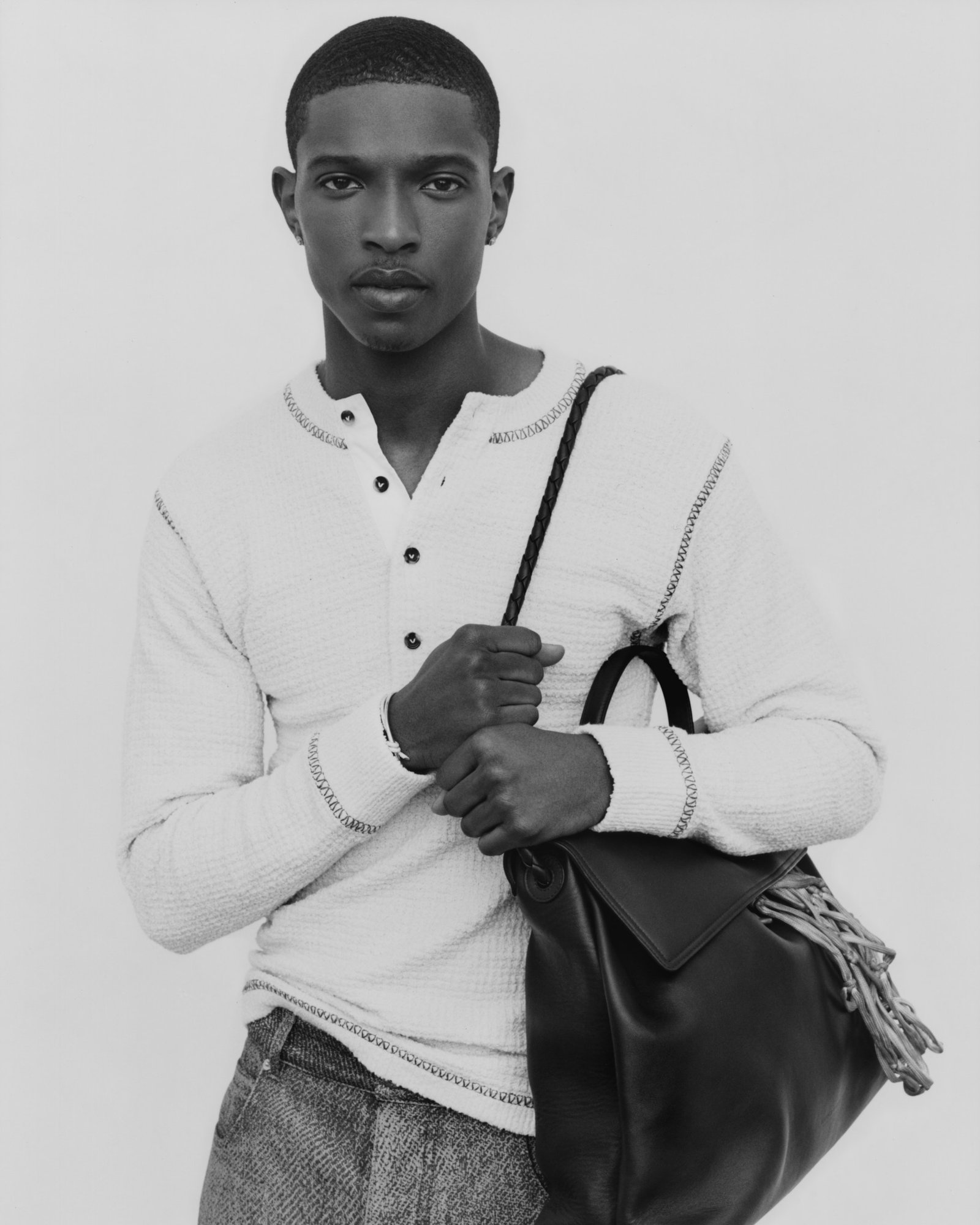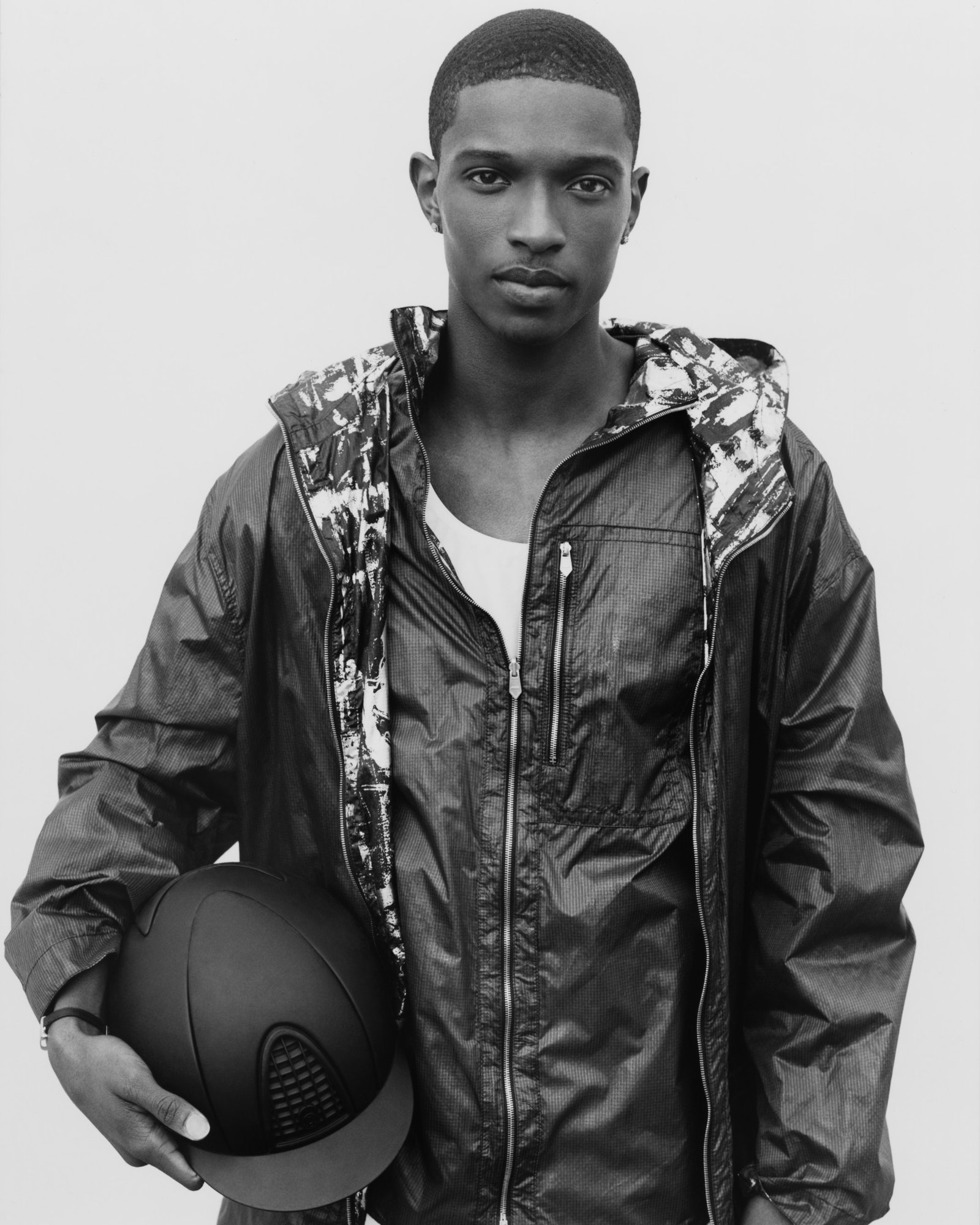 Malik wears sweater, pants, bag and sneakers (in bag) PRADA.