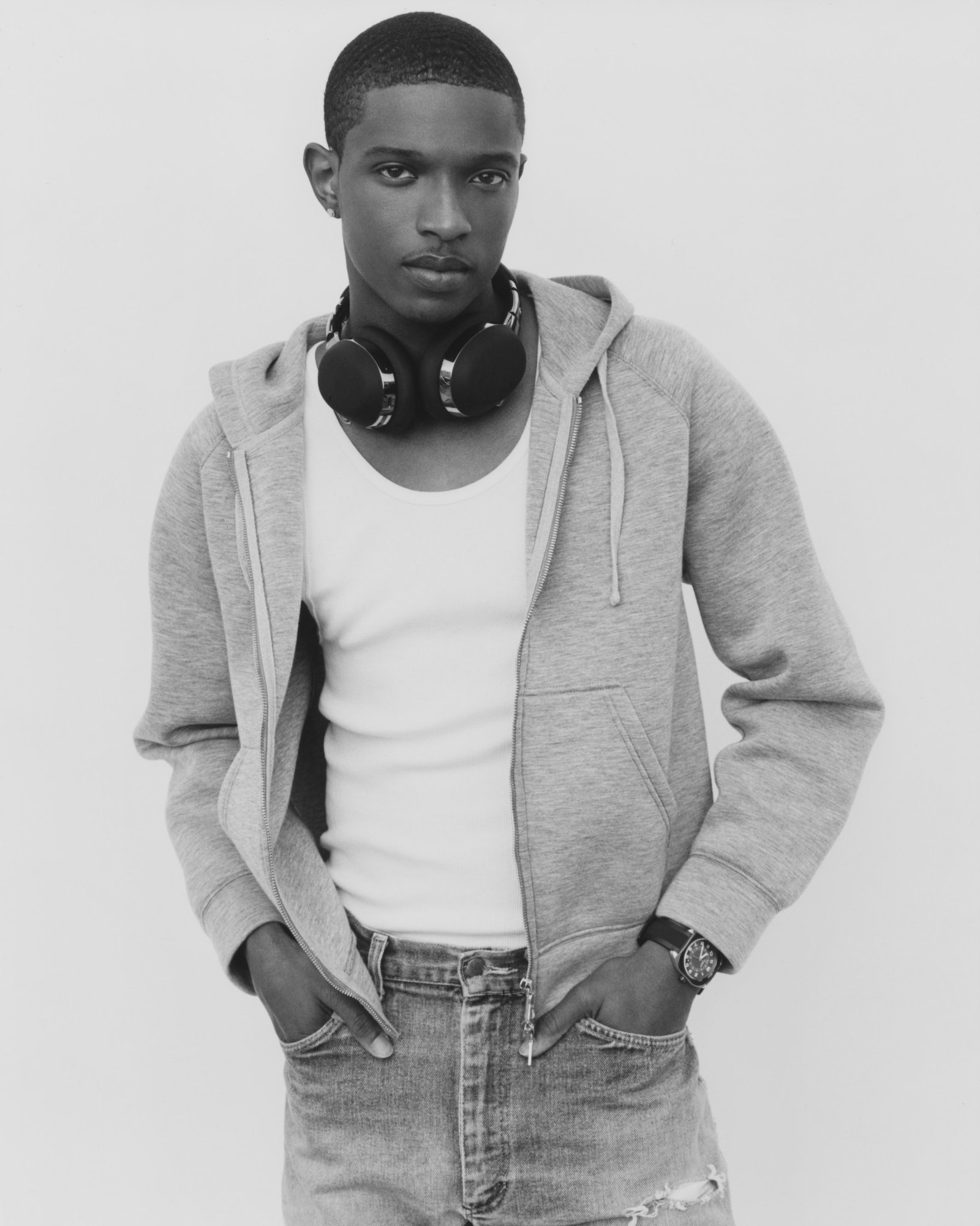 Hoodie OFFICINE GÉNÉRALE. Tank top CALVIN KLEIN. Jeans vintage. Headphones MONTBLANC. Watch HERMÈS.