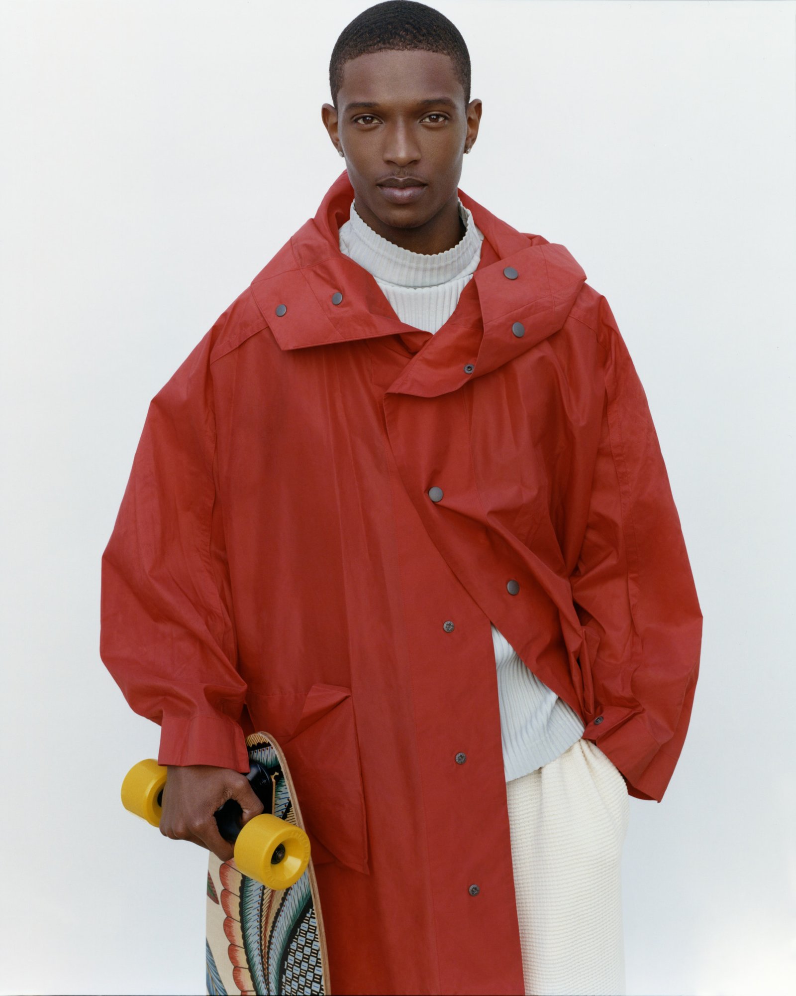 Raincoat, top and pants HOMME PLISSÉ ISSEY MIYAKE. Skateboard HERMÉS.