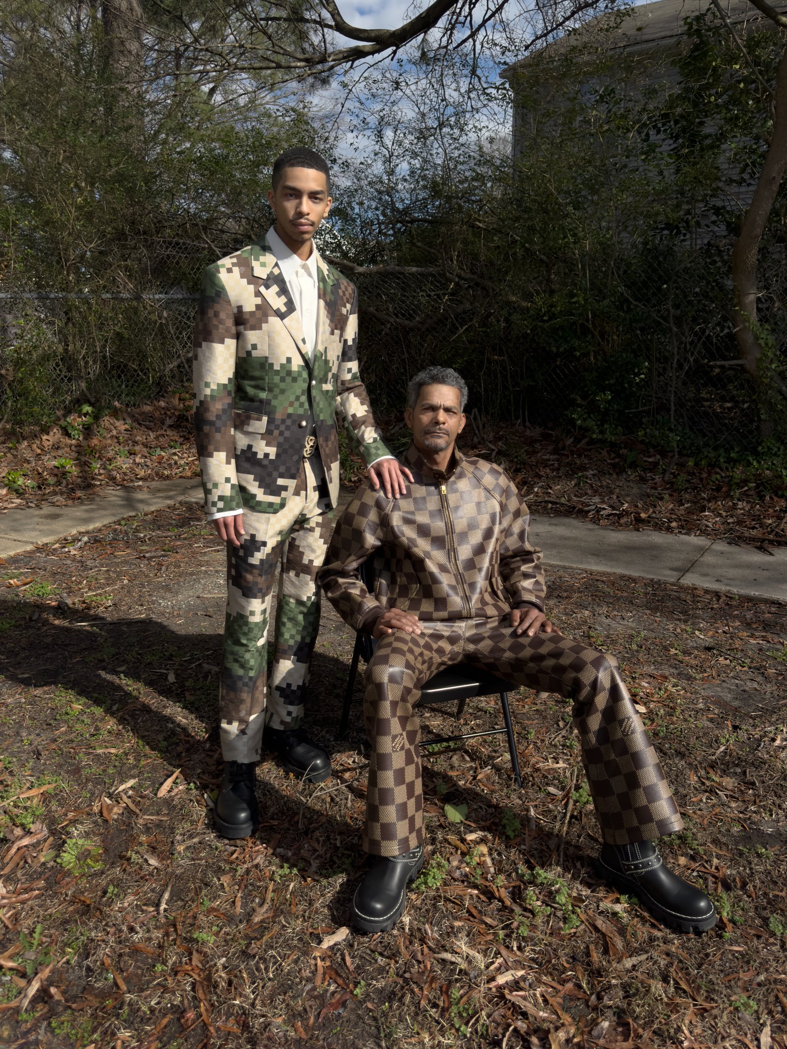Tomari Logan and Kenny Logan, Chesapeake, VA. Tomari (left) wears blazer, shirt, pants, belt and derbys LOUIS VUITTON MEN’S. Kenny (right) wears jacket, pants and boots LOUIS VUITTON MEN’S.
