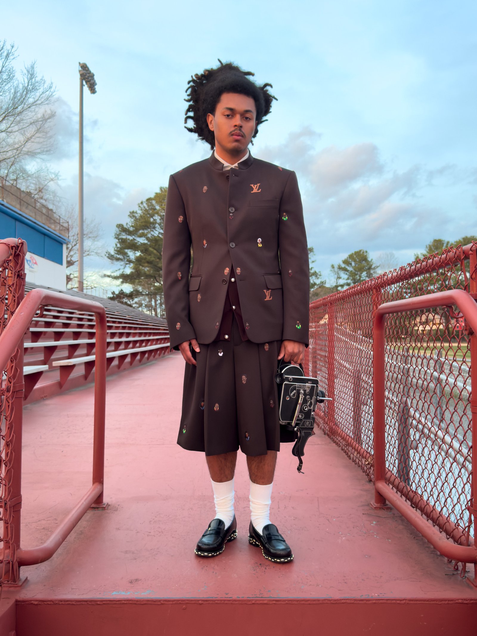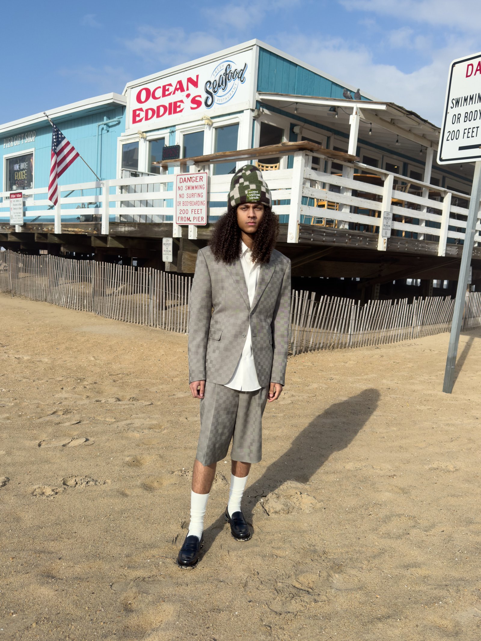 Cinsere Torres, Virginia Beach, VA. Cinsere wears blazer, shirt, shorts, loafers, socks and beanie LOUIS VUITTON MEN’S.