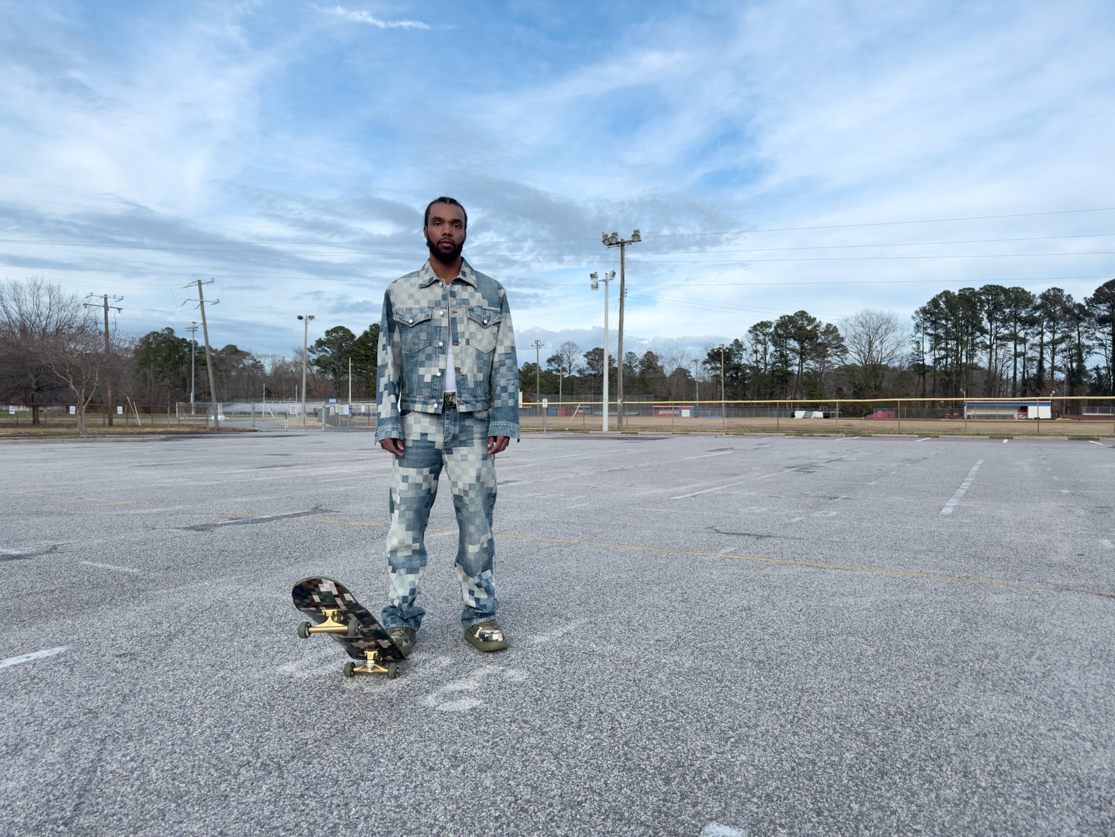 Rahsean Holley, Norfolk, VA. Rahsean wears jacket, t-shirt, pants, sneakers, belt and skateboard LOUIS VUITTON MEN’S.