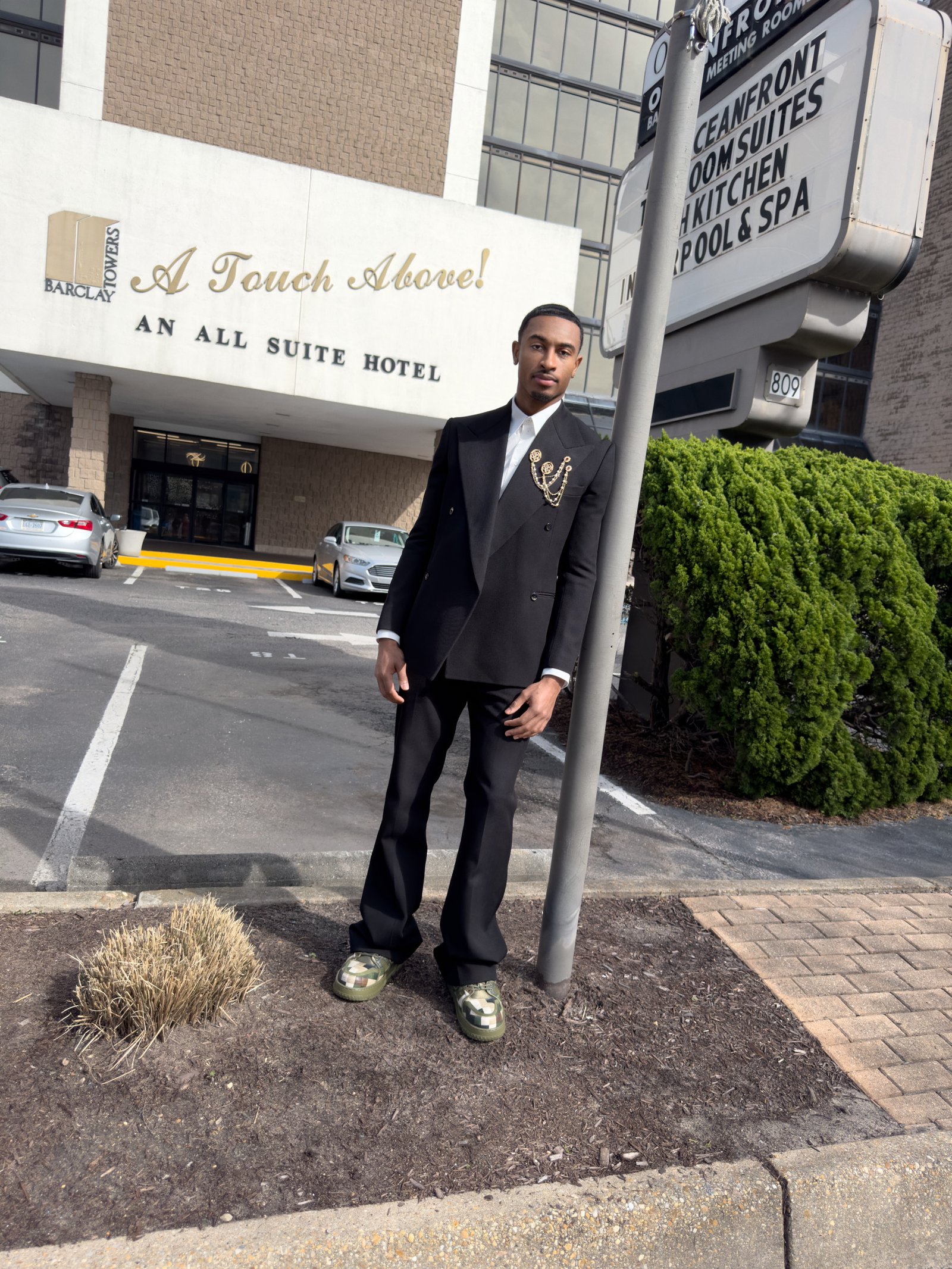 Quincy Green, Dinwiddie, VA. Quincy wears blazer, shirt, pants, sneakers and brooches LOUIS VUITTON MEN’S.