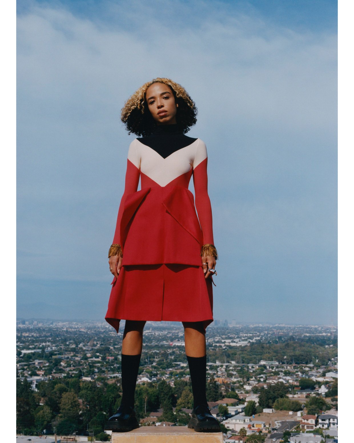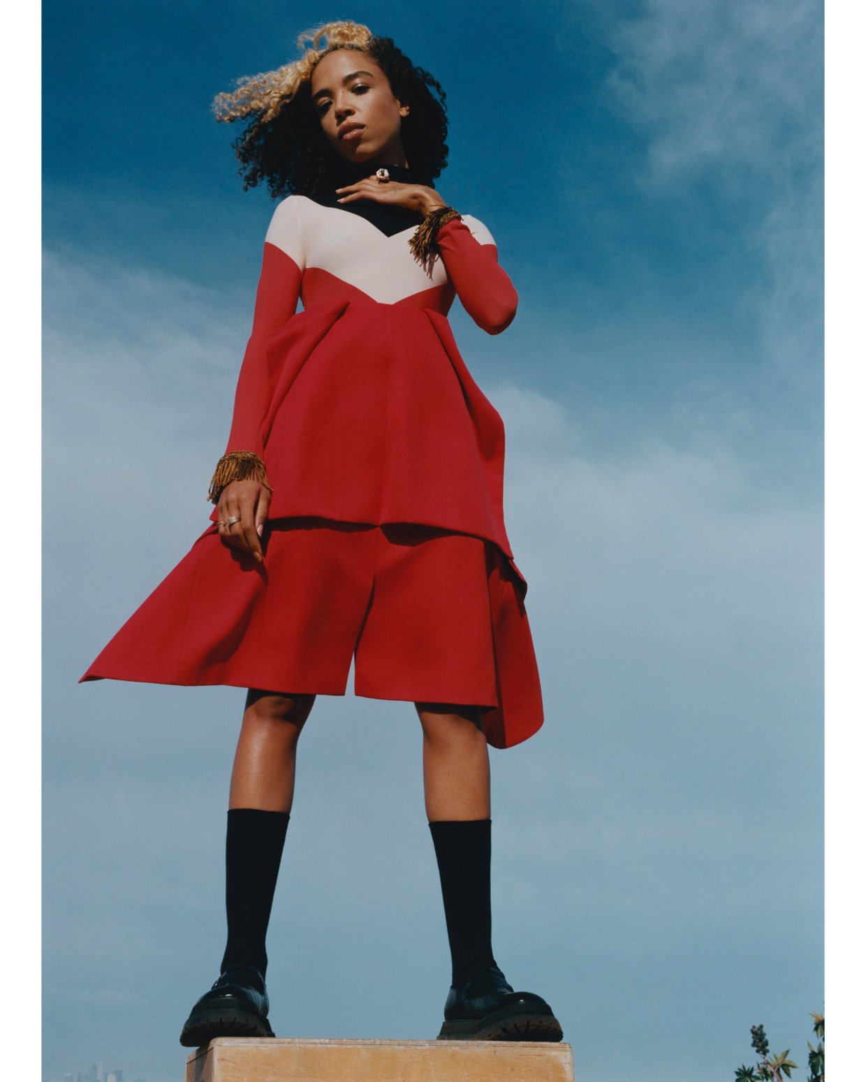 Bodysuit, tailored coat (worn as skirt), loafers and ring (worn on left hand) BURBERRY. Ring’s (worn on right hand) Zsela’s own. Socks stylist’s own.