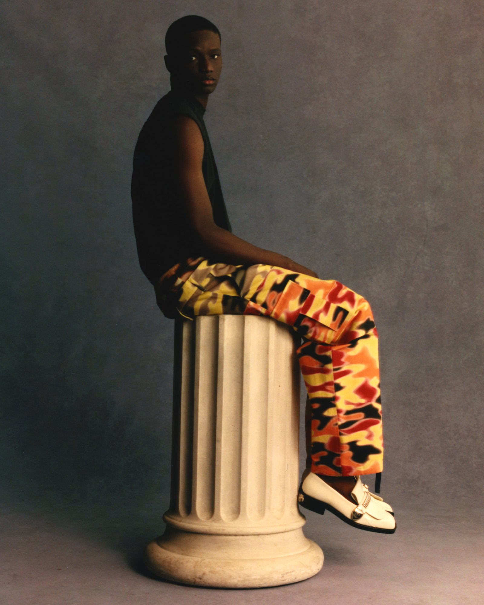 Mamadou wears tank, pants, and loafer BLUEMARBLE.